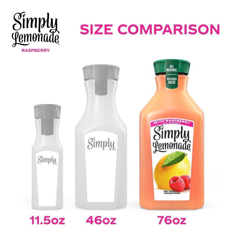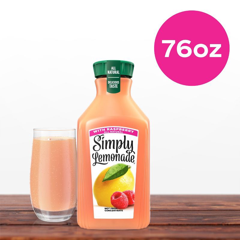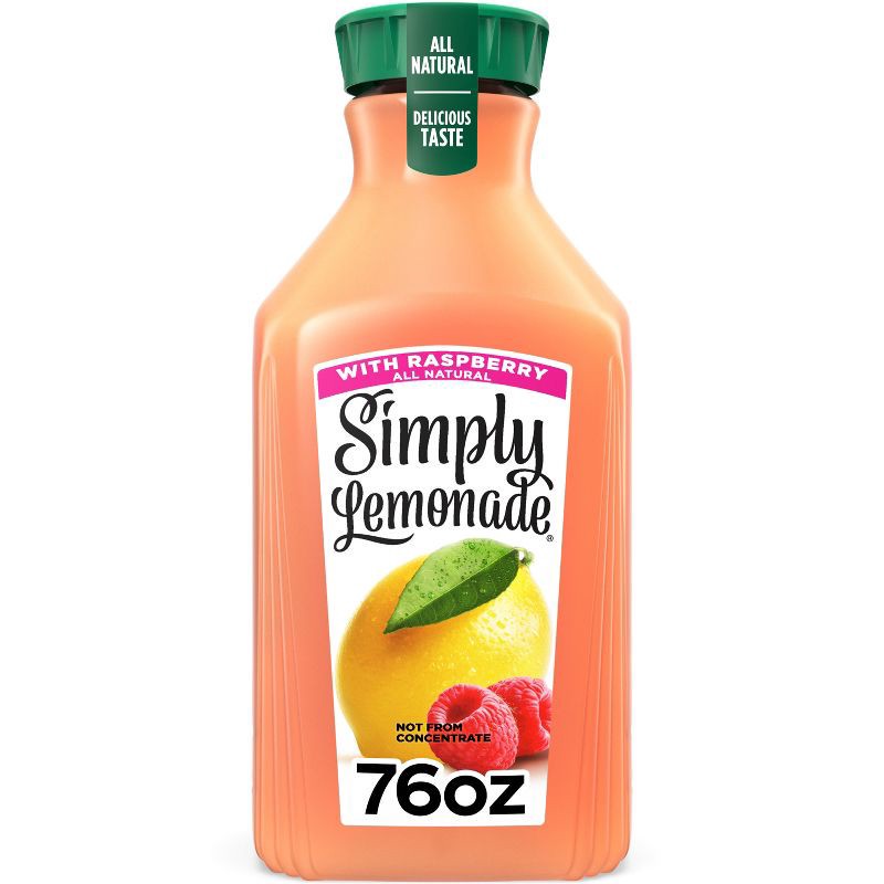 - 76 fl oz bottle of Simply Lemonade with Raspberry in a signature Simply carafe with distinctive cap and tear strip