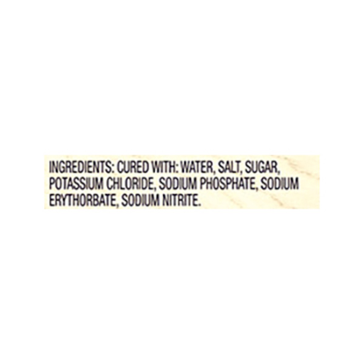 Cure with: Water, Salt, Sugar, Potassium Chloride, Sodium Phosphate, Sodium Erythorbate, Sodium Nitrite.