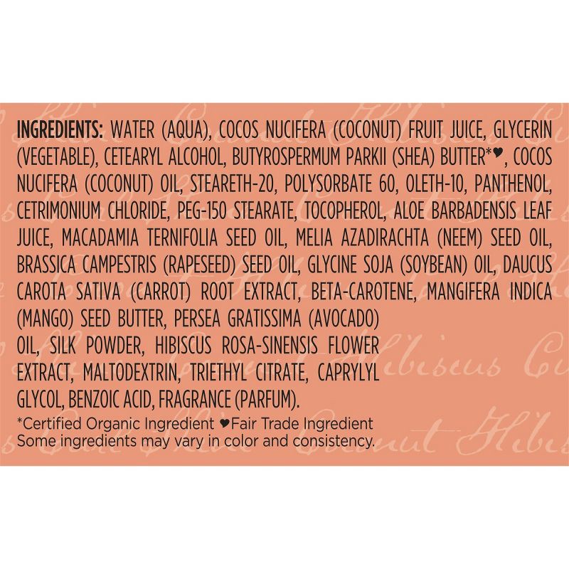 WATER, BUTYROSPERMUM PARKII (SHEA BUTTER)* +, COCOS NUCIFERA (COCONUT) OIL, MACADAMIA TERNIFOLILA SEED OIL, MANGIFERA INDICA (MANGO) SEED BUTTER, PERSEA GRATISSIMA (AVOCADO) OIL, GLYCERIN (VEGETABLE),…