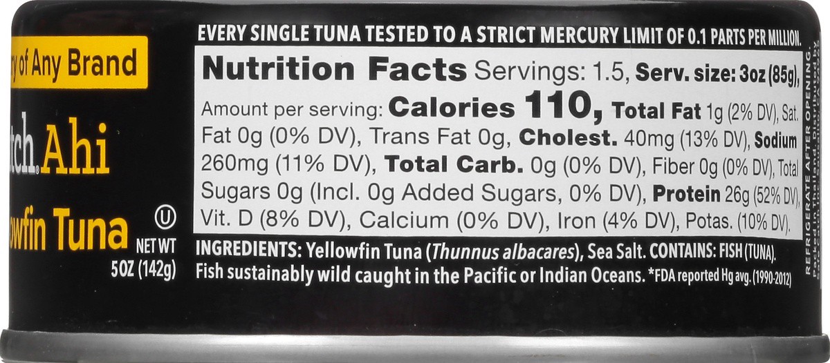 42.5 g protein per can. Paleo. Non-GMO Project Verified. nongmoproject.org. Lowest mercury of any brand. 8 x lower mercury than Albacore tuna (FDA (FDA reported hg avg. (1990-2012)). Additive free. Sl…