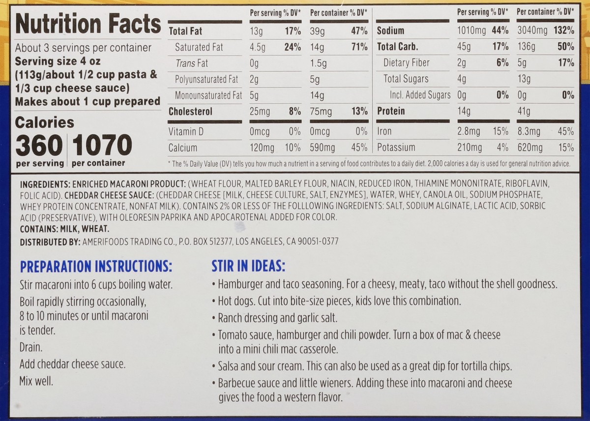 Enriched Macaroni Product: (Wheat Flour, Malted Barley Flour, Niacin, Reduced Iron, Thiamine Mononitrate, Riboflavin, Folic Acid), Cheddar Cheese Sauce: (Cheddar Cheese [Milk, Cheese Culture, Salt, En…