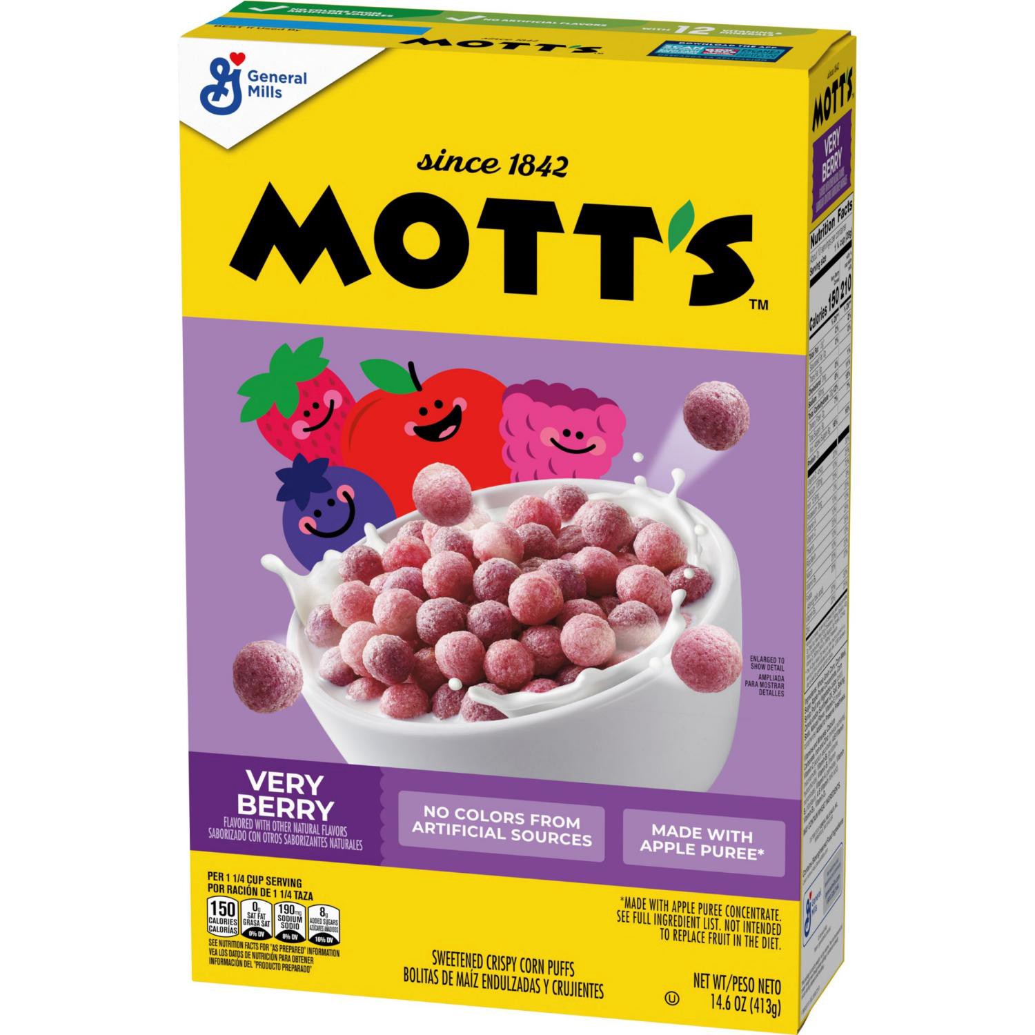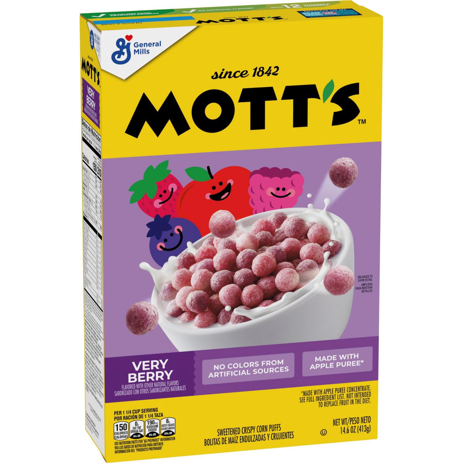 Mott's Very Berry Cereal is the perfect pick to start your day! These sweetened crispy corn puffs are a delight for the whole family. This delicious cereal is made without colors from artificial sourc…