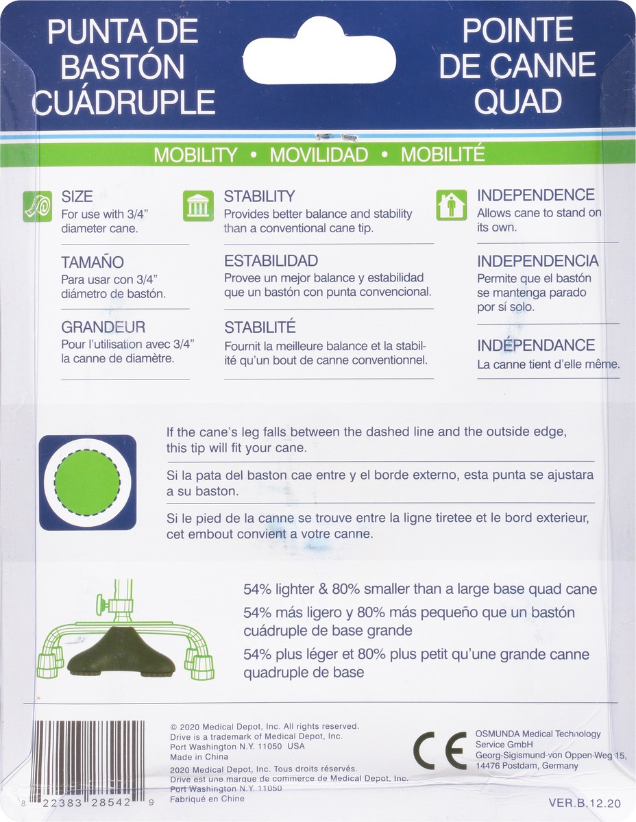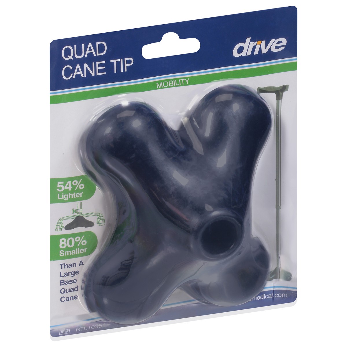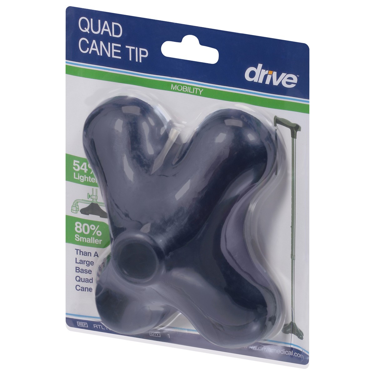Mobility. 54% lighter, 80% smaller than a large base quad cane. Size: For use with 3/4 inch diameter cane. Stability: Provides better balance and stability than a conventional cane tip. Independence: …