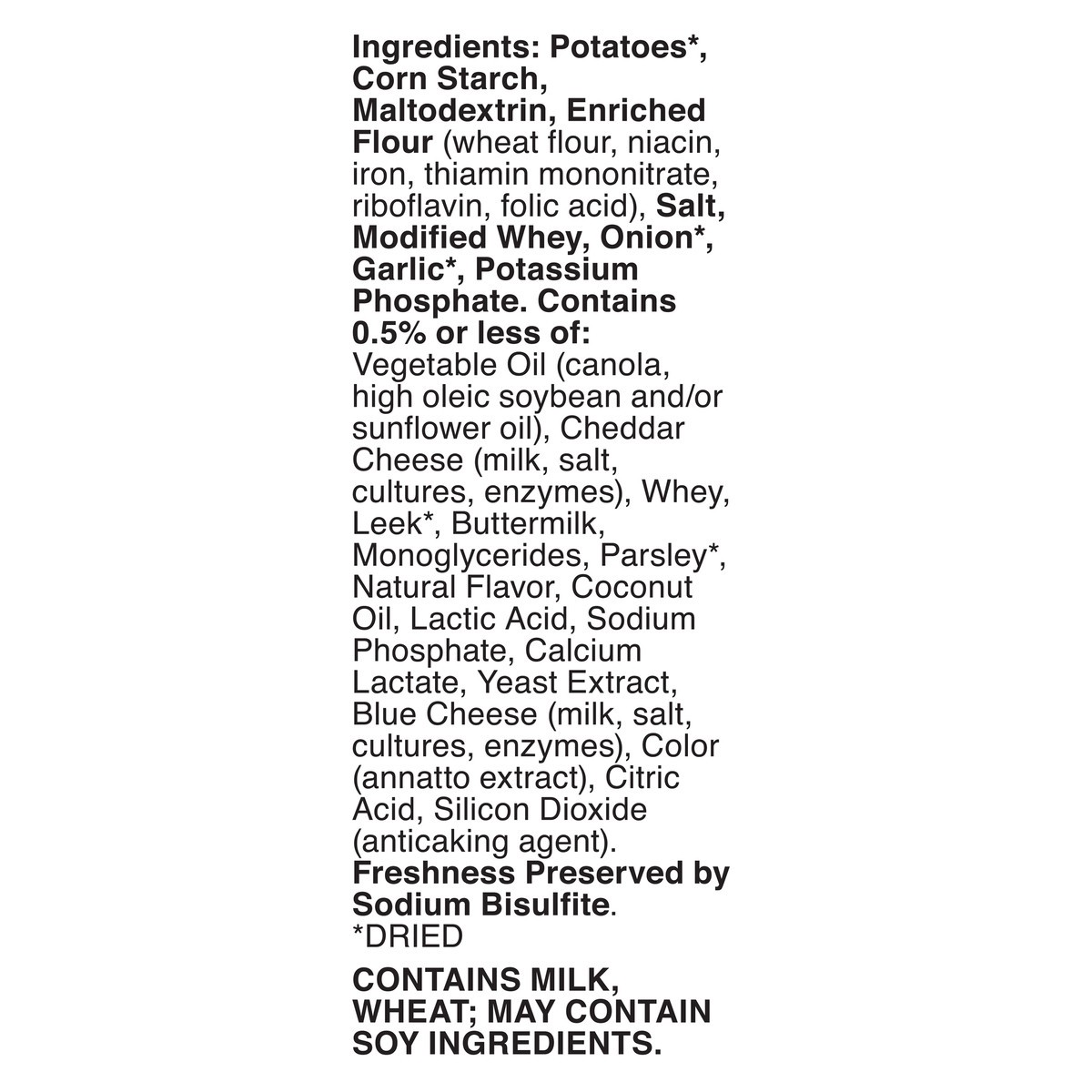 Potatoes*, Corn Starch, Maltodextrin, Enriched Flour (Wheat Flour, Niacin, Iron, Thiamin Mononitrate, Riboflavin, Folic Acid), Salt, Modified Whey, Onion*, Garlic*, Potassium Phosphate. Contains 0.5% …