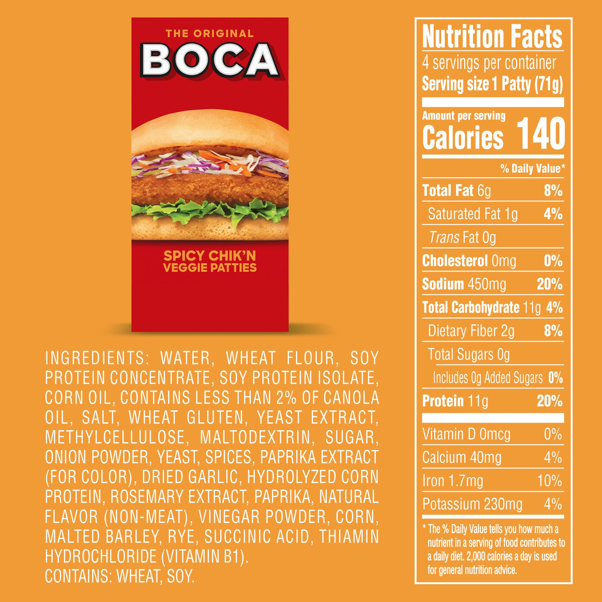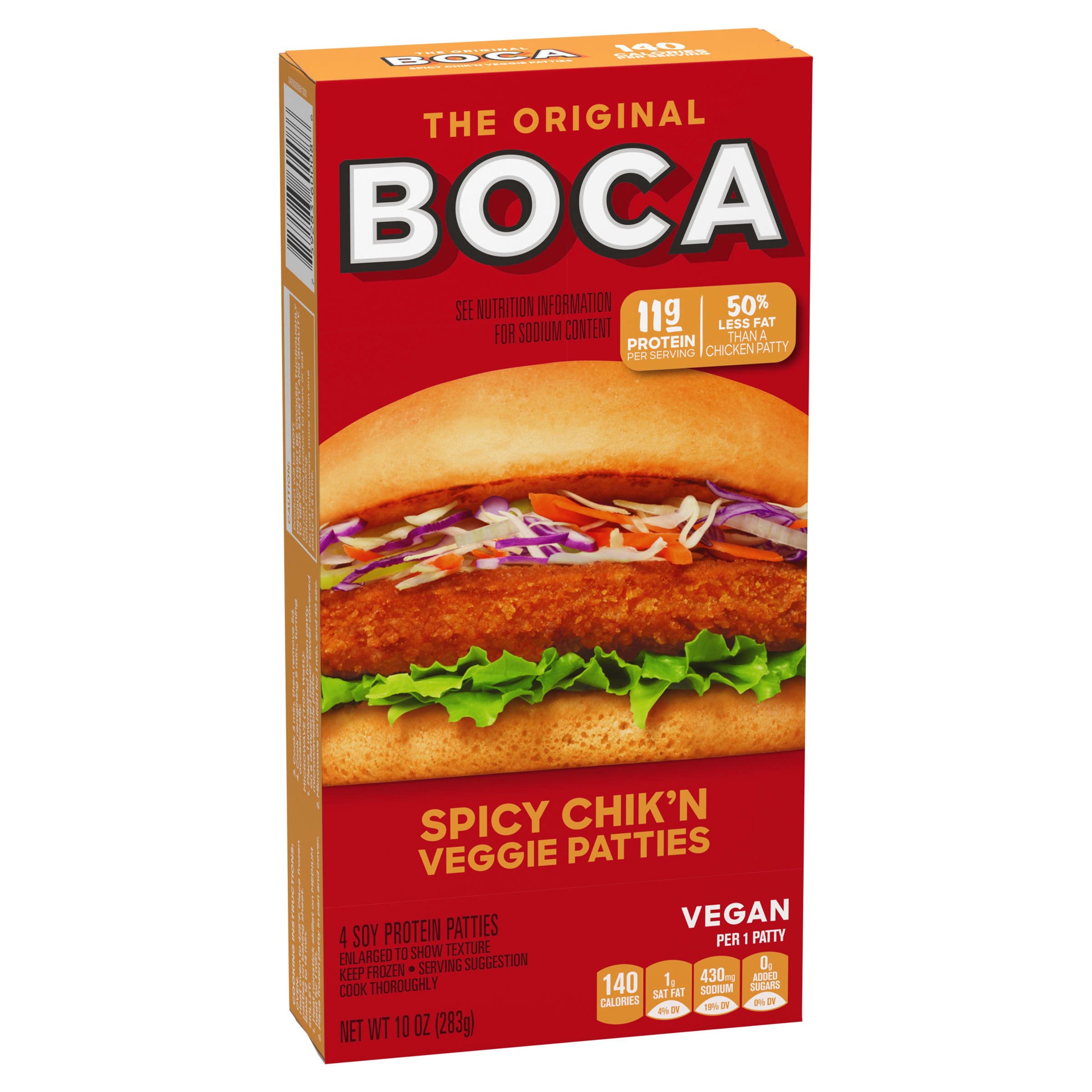 BOCA Spicy Chik'n Vegan Patties are an easy-to-make meat substitute that's perfect for making sandwiches or topping salads. Our plant-based patties have a savory, spicy kick, and each patty contains 1…