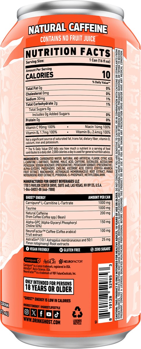 - TOTAL TRANSPARENCY: All Ghost products feature a transparent label that fully discloses the dose of each active ingredient. Zero proprietary blends means you know what you’re getting in each and every sip. Ghost Energy contains zero-sugars and is vegan-friendly and gluten-free.