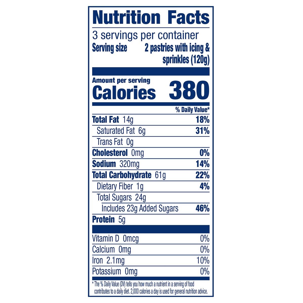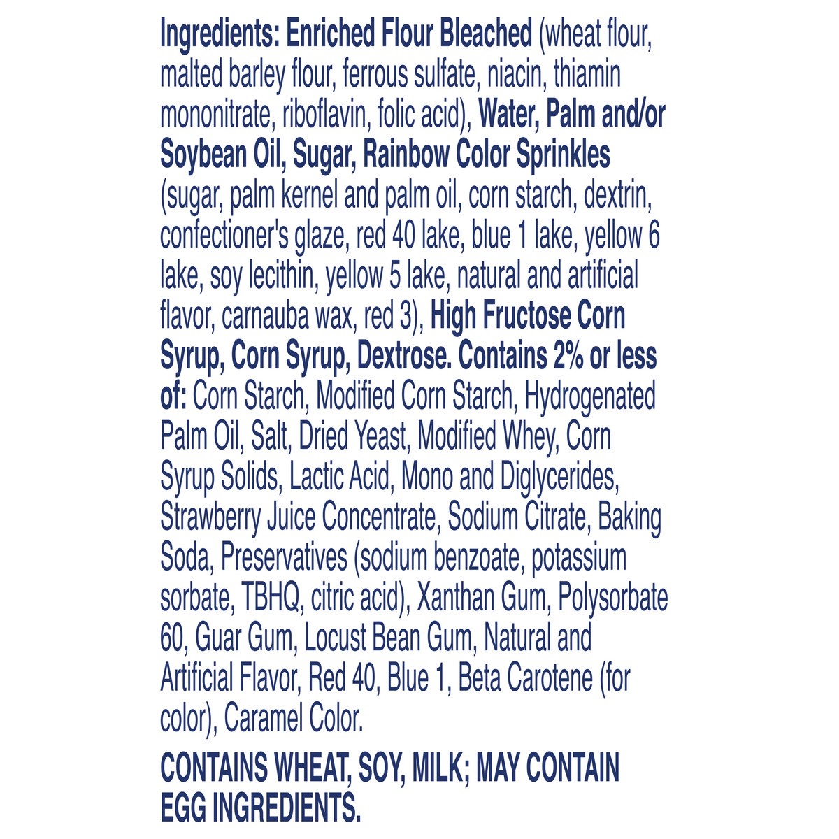 Enriched Flour Bleached (Wheat Flour, Malted Barley Flour, Ferrous Sulfate, Niacin, Thiamin Mononitrate, Riboflavin, Folic Acid), Water, Palm and/or Soybean Oil, Sugar, Rainbow Color Sprinkles (Sugar,…
