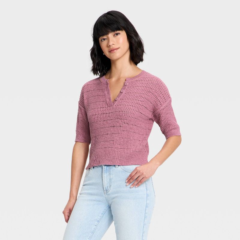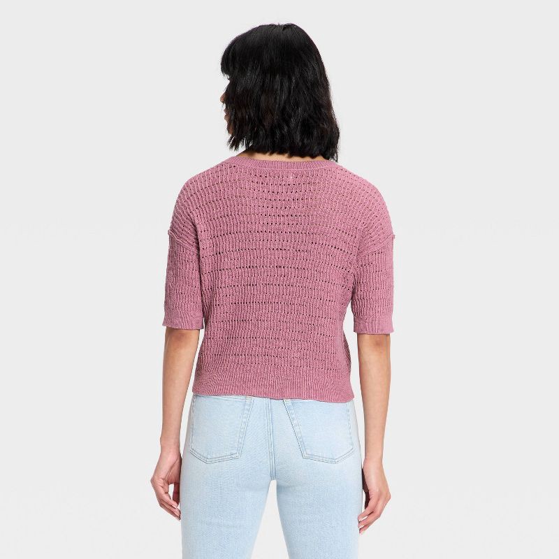 Women's Short Sleeve Button-Up Crewneck Pullover Sweater - Universal Thread™ Mauve XL