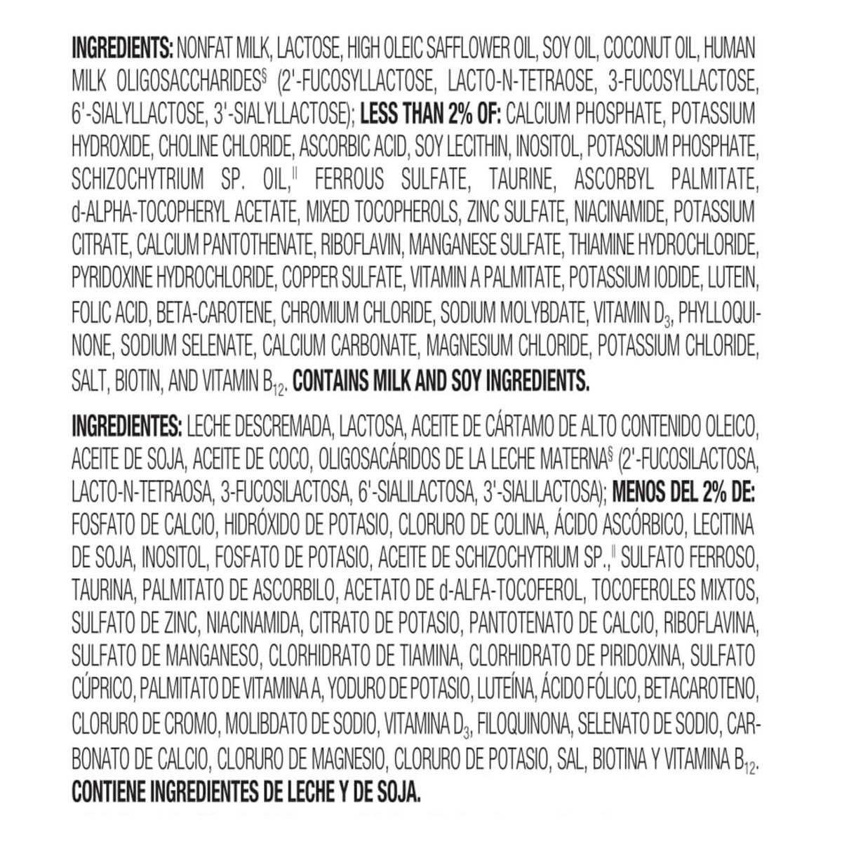 Nonfat Milk, Lactose, High Oleic Safflower Oil, Soy Oil, Coconut Oil, Human Milk Oligosaccharides (HMO, Not from Human Milk) (2'-Fucosyllactose, Lacto-N-Tetraose, 3-Fucosyllactose, 6'-Sialyllactose, 3…