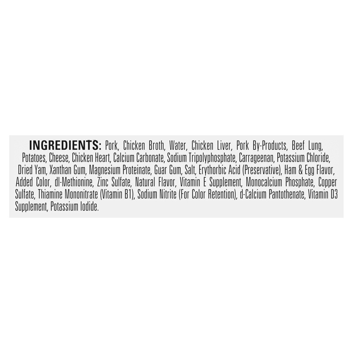 Pork, Chicken Broth, Water, Chicken Liver, Pork By-Products, Beef Lung, Potatoes, Cheese, Chicken Heart, Calcium Carbonate, Sodium Tripolyphosphate, Carrageenan, Potassium Chloride, Dried Yam, Xanthan…