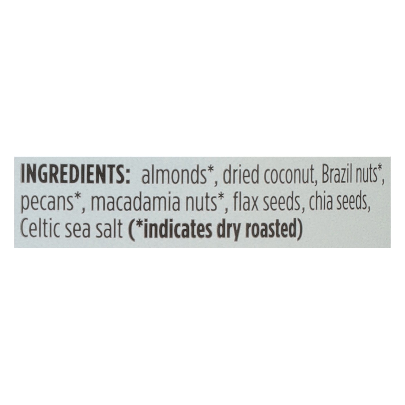 Almonds (Indicates Dry Roasted), Dried Coconut, Brazil Nuts (Indicates Dry Roasted), Pecans, Macadamia Nuts (Indicates Dry Roasted), Flax Seeds, Chia Seeds, Celtic Sea Salt.
