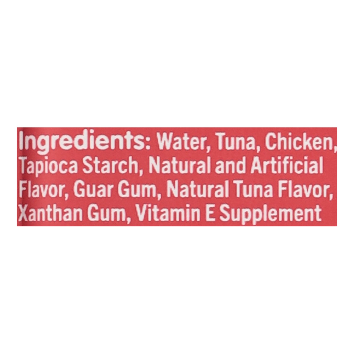 Water, Tuna, Chicken, Tapioca Starch, Natural and Artificial Flavor, Guar Gum, Natural Tuna Flavor, Xanthan Gum, Vitamin E Supplement.