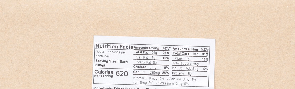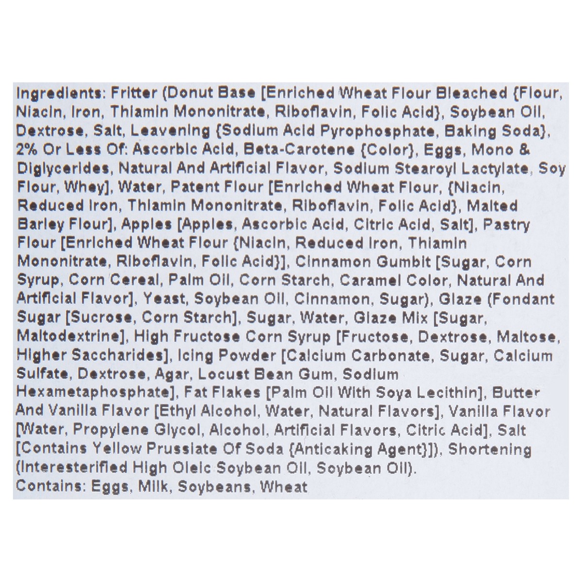 Fritter (Donut Base [Enriched Wheat Flour Bleached (Flour, Niacin, Iron, Thiamin Mononitrate, Riboflavin, Folic Acid), Soybean Oil, Dextrose, Salt, Leavening (Sodium Acid Pyrophosphate, Baking Soda), …