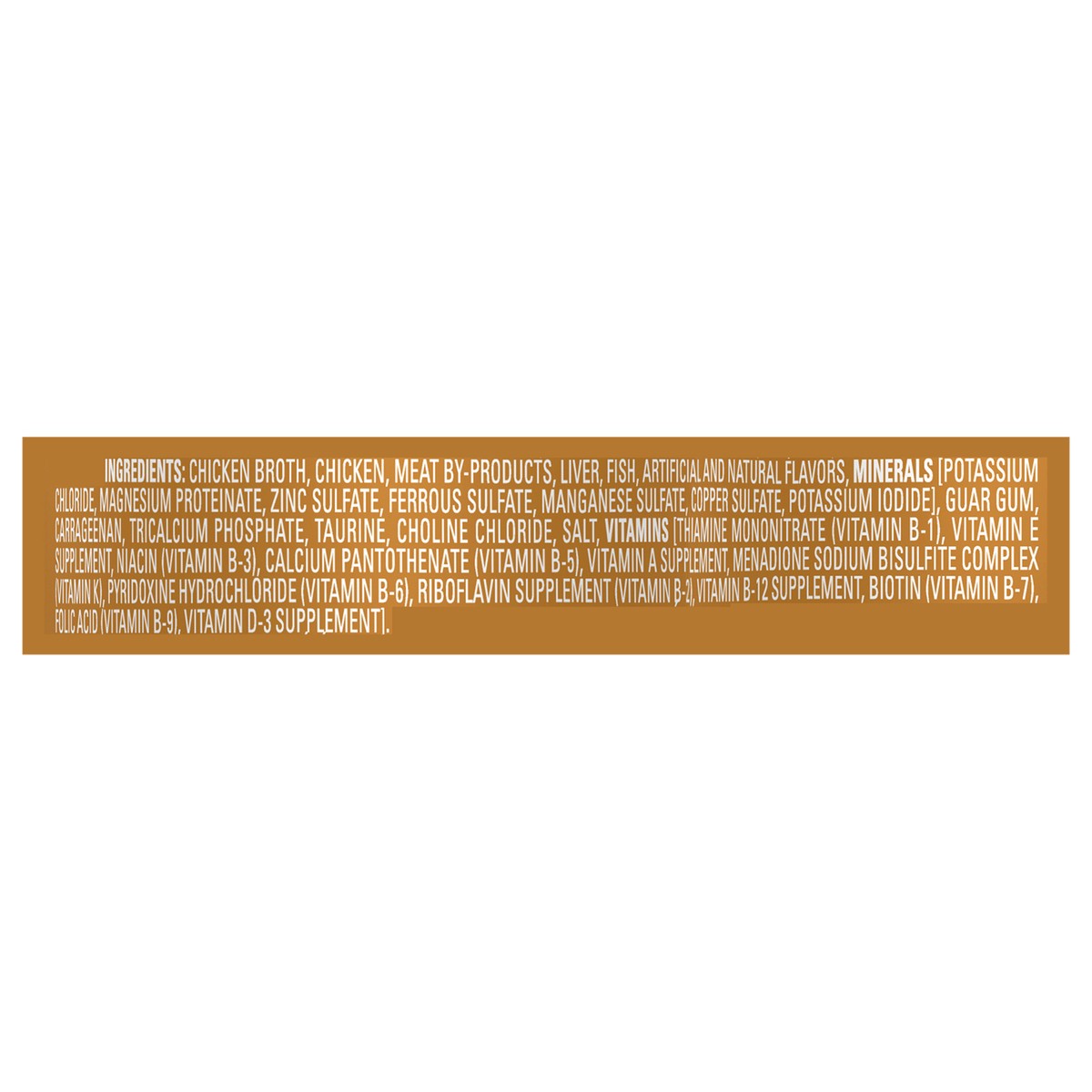 Chicken Broth, Chicken, Meat By-Products, Liver, Fish, Artificial and Natural Flavors, Minerals [Potassium Chloride, Magnesium Proteinate, Zinc Sulfate, Ferrous Sulfate, Manganese Sulfate, Copper Sulf…