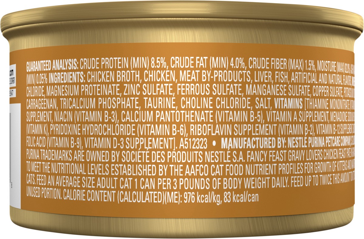 Calorie Content (calculated) (ME): 976 kcal/kg, 83kcal/can. Fancy Feast Gravy Lovers chicken feast pate in gravy is formulated to meet the nutritional levels established by the AAFCO cat food nutrient…