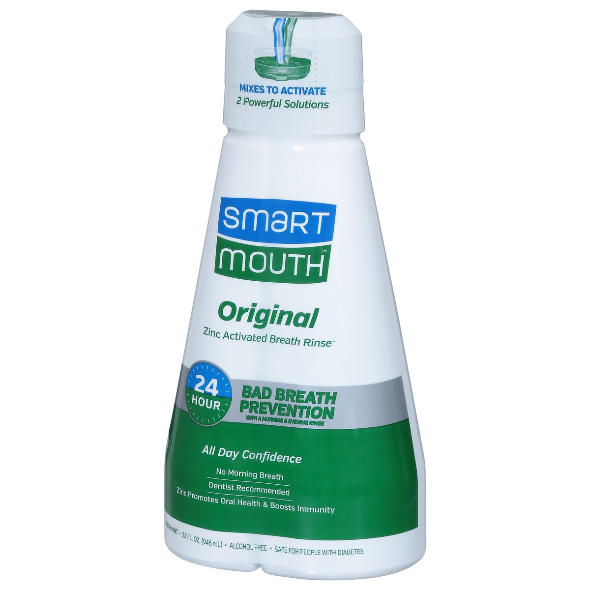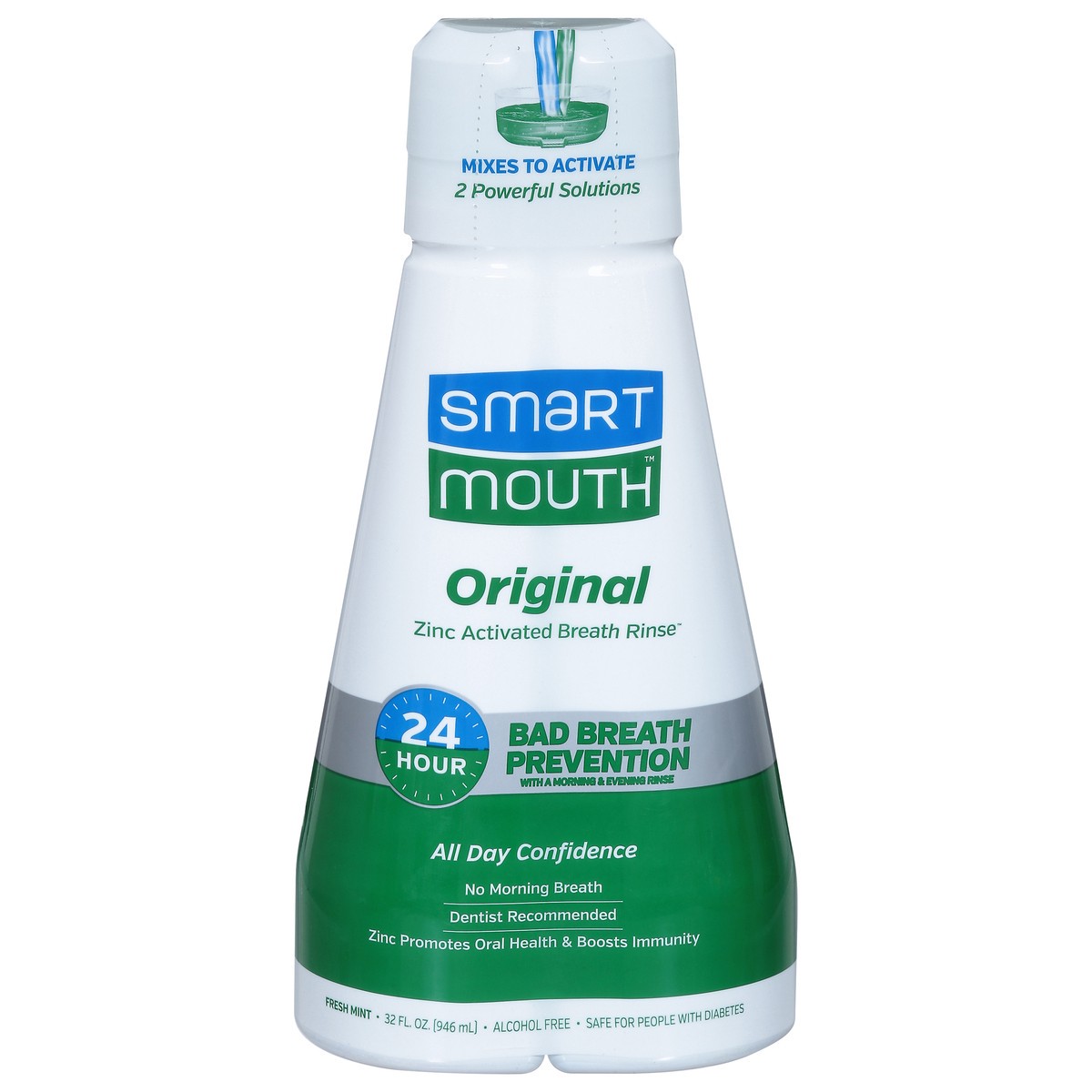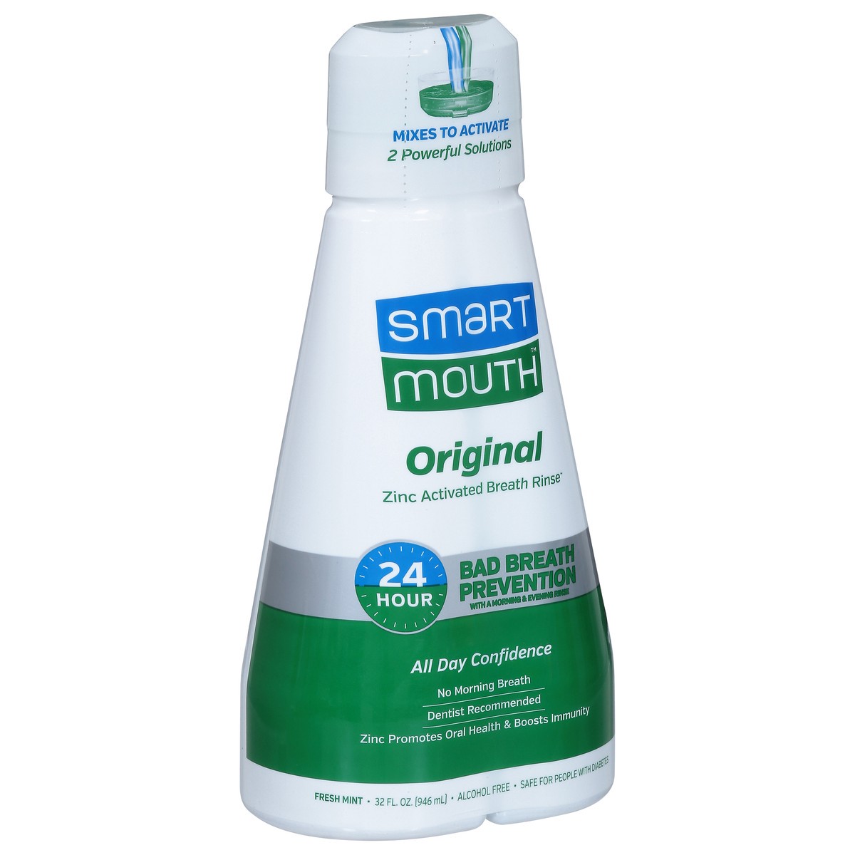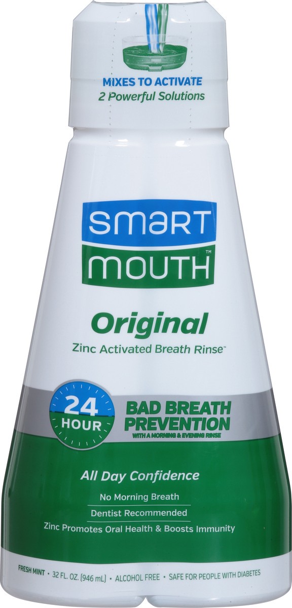 The SmartMouth Original Activated Breath Rinse contains a zinc ion solution that activates as you pour to eliminate bad breath instantly for up to 24 hours.