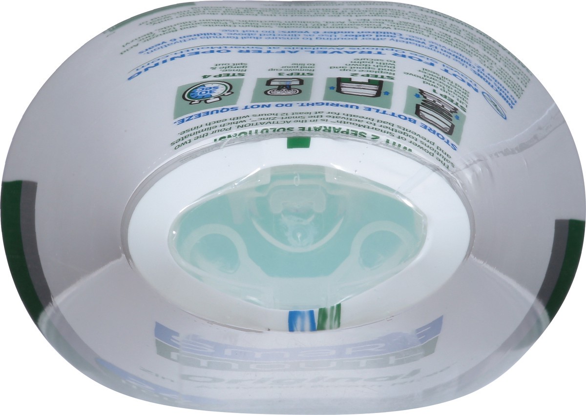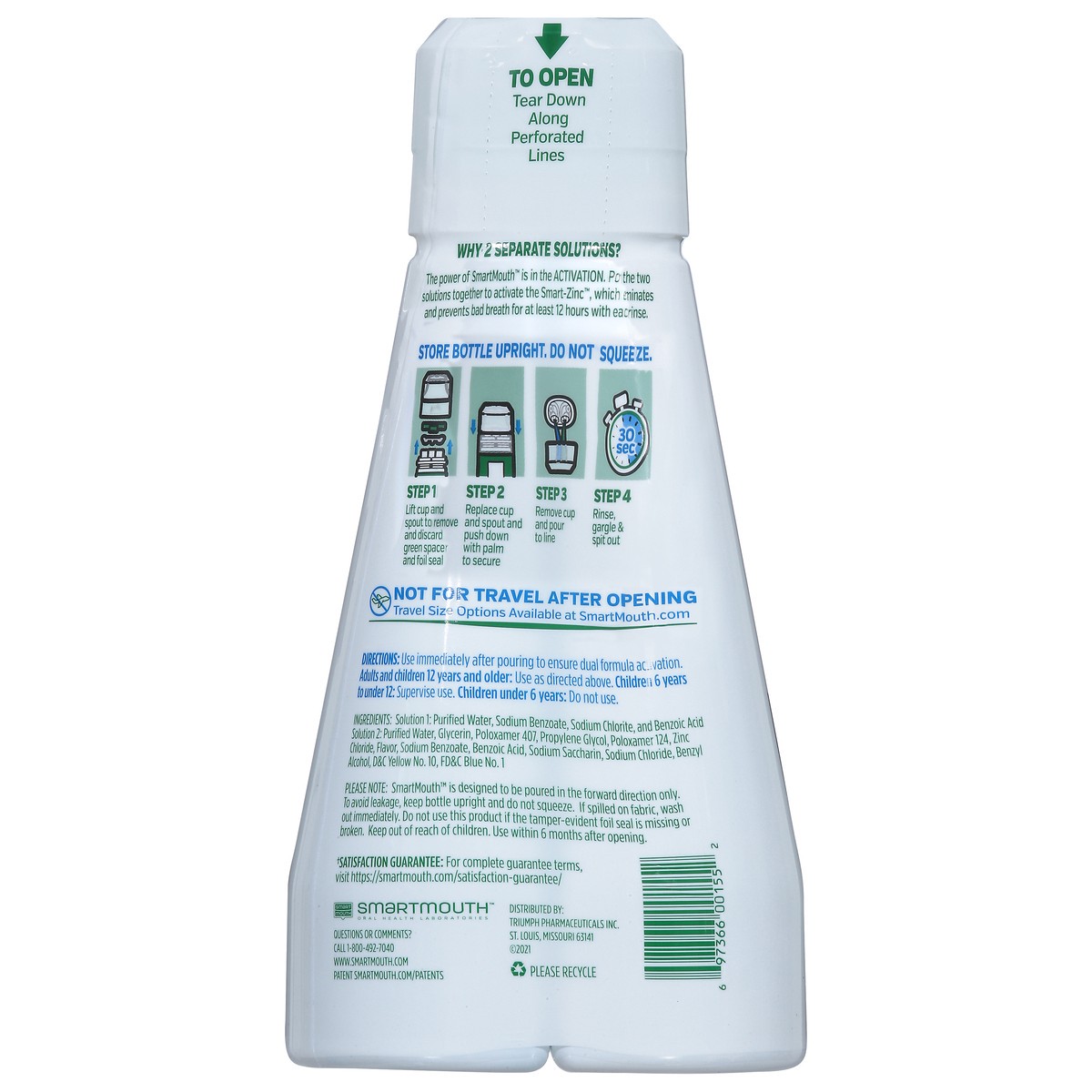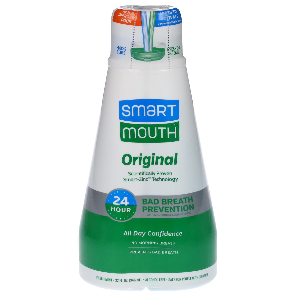 The SmartMouth Original Activated Breath Rinse contains a zinc ion solution that activates as you pour to eliminate bad breath instantly for up to 24 hours.