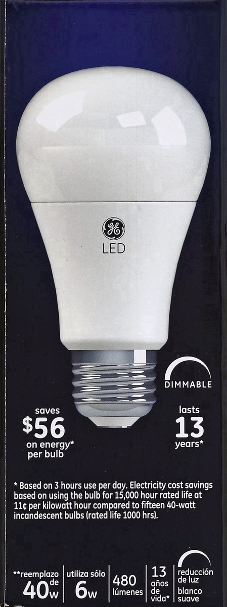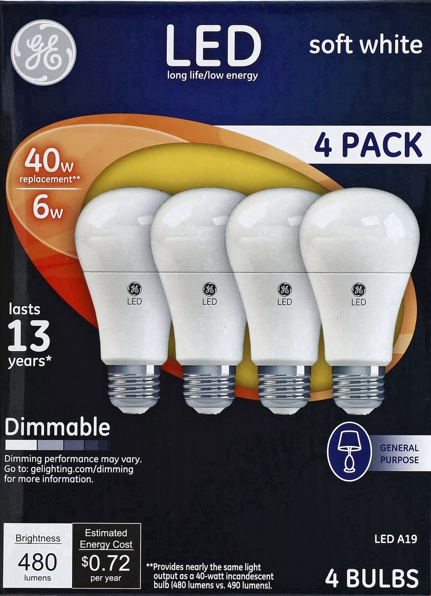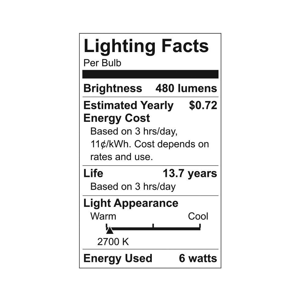 Brightness Quality: 480 Lumens. Energy Info: $0.72 based on 3 hrs/day, 11 cents/kWh. Cost depends on rates and use. 6 Watts. 120 Volts. Package Info: 4-Pack 4 Bulb Info: LED Indoor Is Dimmable Medium.…
