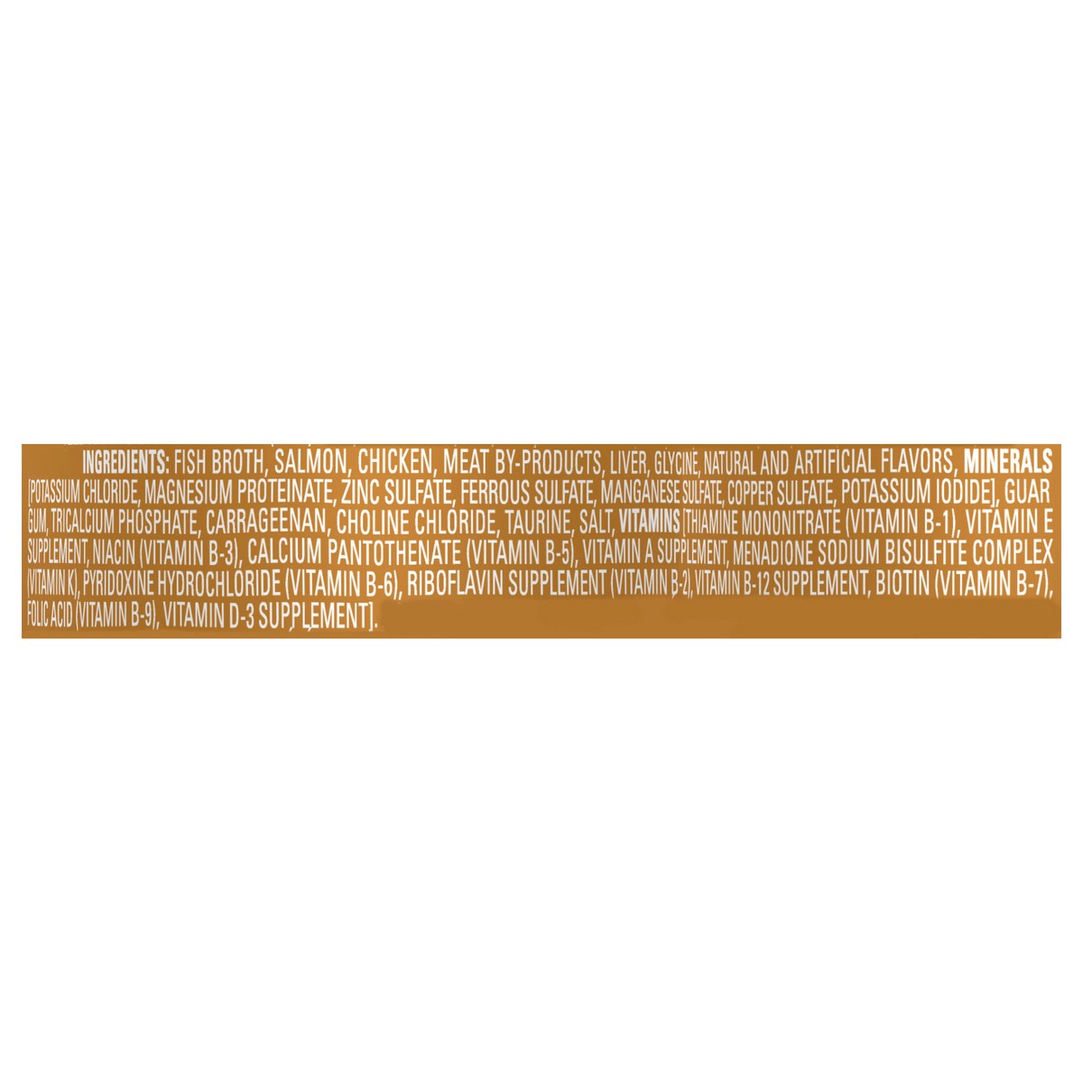 Fish Broth, Salmon, Chicken, Meat By-Products, Liver, Glycine, Natural and Artificial Flavos, Minerals Potassium Chloride, Magnesium Proteinate, Zinc Sulfate, Ferrous Sulfate, Manganese Sulfate, Coppe…
