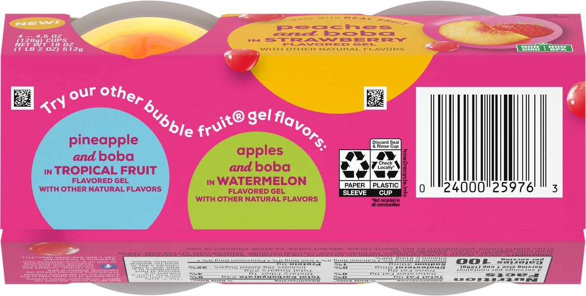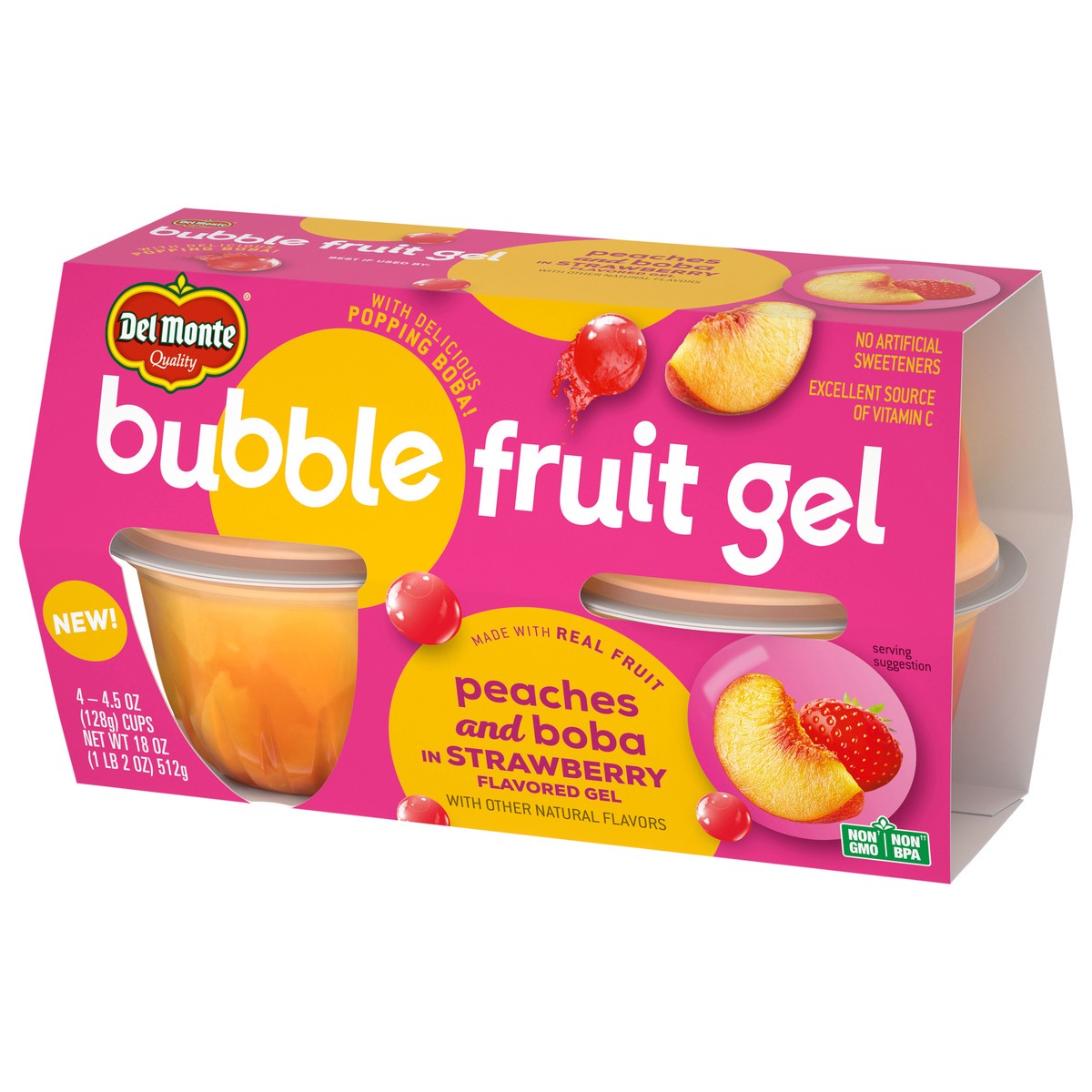 - One 4-Pack of Del Monte Bubble Fruit Peaches in Strawberry Gel Cup Snacks.