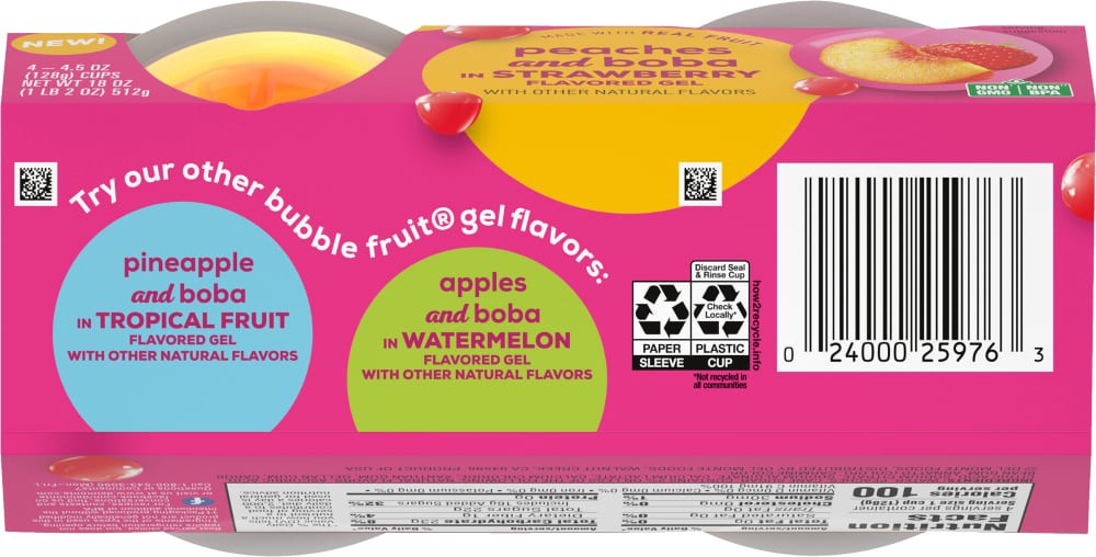 Del Monte Bubble Fruit Peaches in Strawberry Gel Fruit Cup Snacks has a taste explosion in every bite! Each Fruit Cup Snack contains real fruit and popping boba with delicious fruit flavored gel for a…