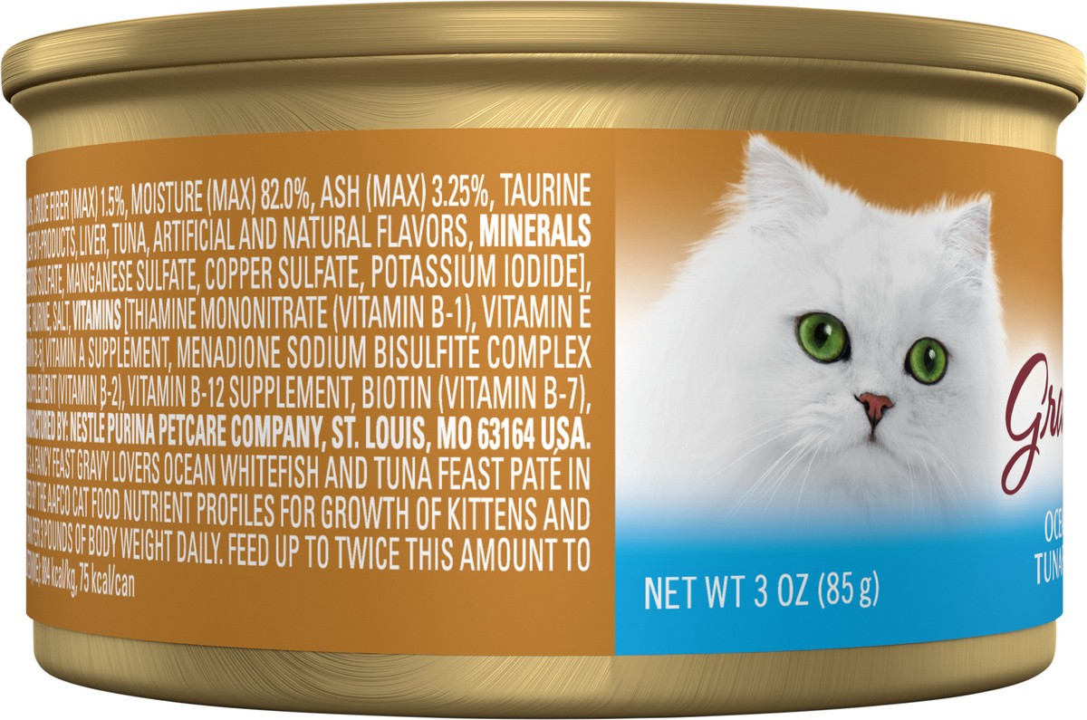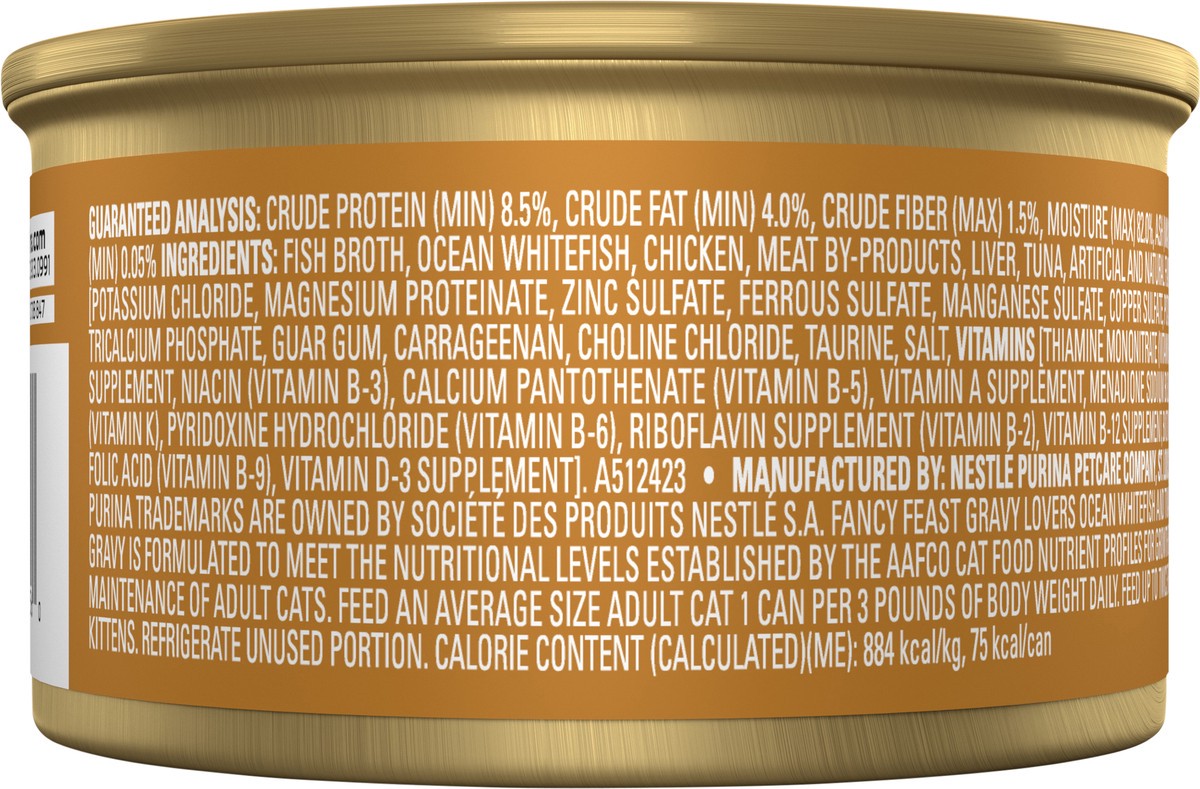Calorie Content (Calculated) (ME): 884 kcal/kg, 75 kcal/can. Fancy Feast Gravy Lovers Ocean Whitefish and Tuna Feast Pate in Gravy is formulated to meet the nutritional levels established by the AAFCO…