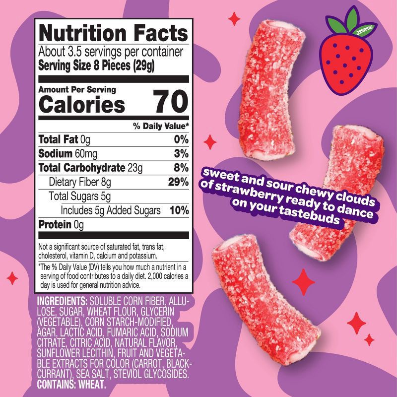 SOLUBLE CORN FIBER, ALLULOSE, SUGAR, WHEAT FLOUR, GLYCERIN (VEGETABLE), CORN STARCH-MODIFIED AGAR, LACTIC ACID, FUMARIC ACID, SODIUM CITRATE, CITRIC ACID, NATURAL FLAVOR, SUNFLOWER LECITHIN, FRUIT AND…