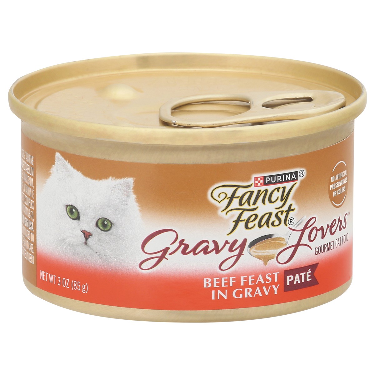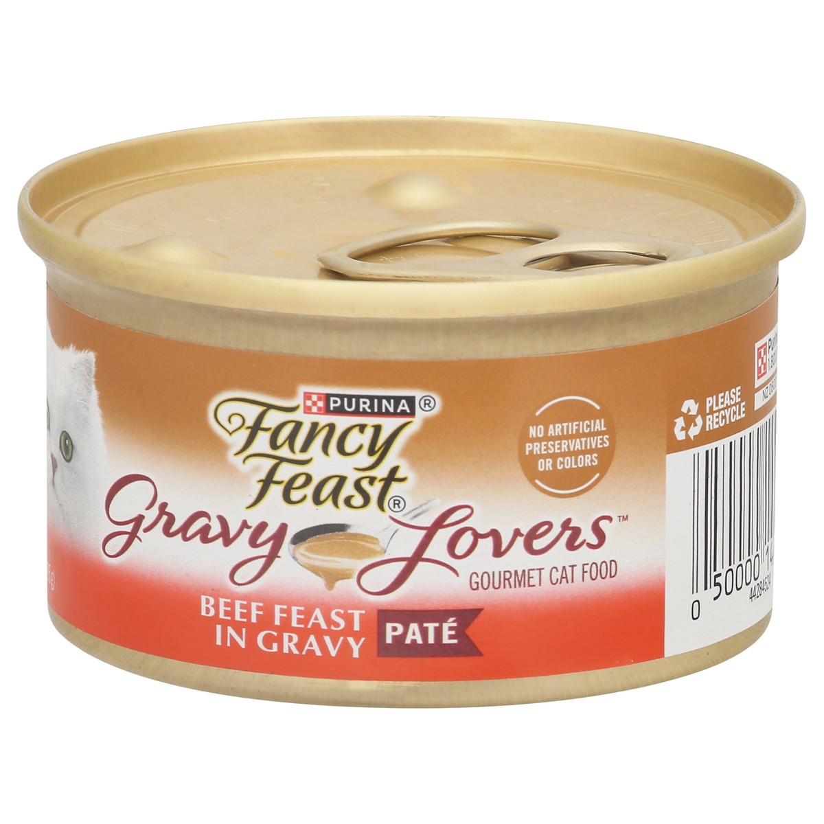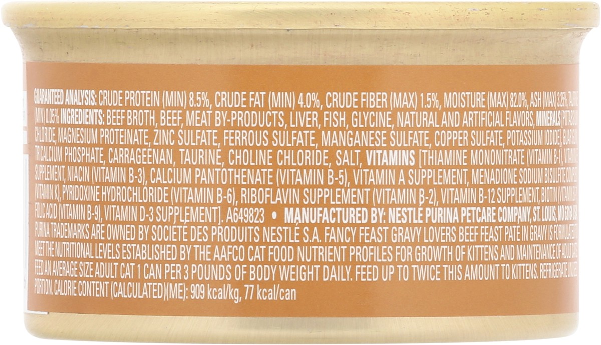 Calorie Content: (Calculated): ME 909 kcal/kg; 77 kcal/can. Fancy Feast Gravy Lovers Beef Feast Pate in Gravy is formulated to meet the nutritional levels established by the AAFCO cat food nutrient pr…