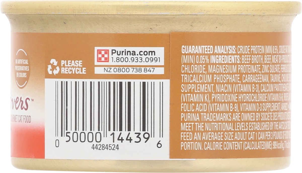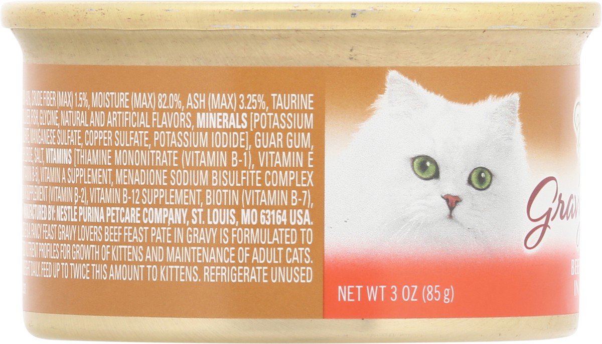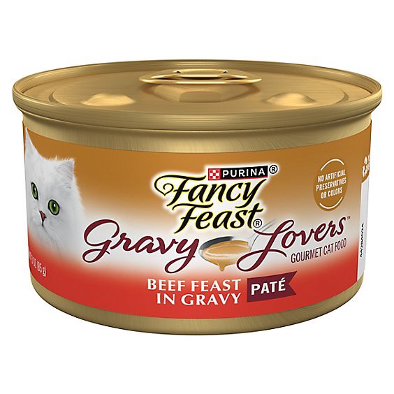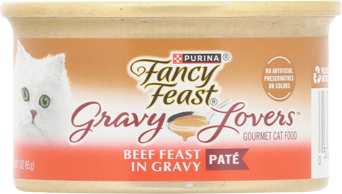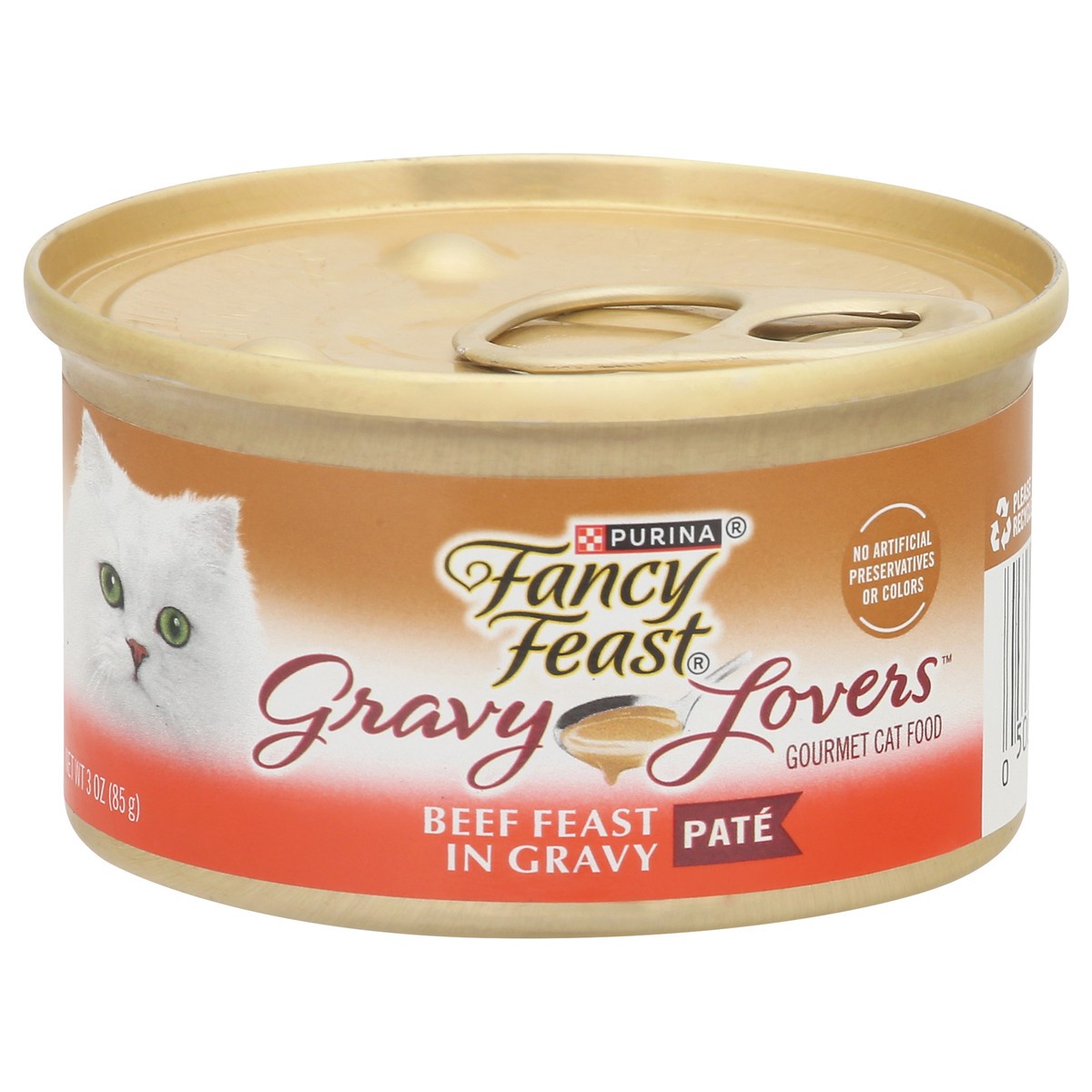 Calorie Content: (Calculated): ME 909 kcal/kg; 77 kcal/can. Fancy Feast Gravy Lovers Beef Feast Pate in Gravy is formulated to meet the nutritional levels established by the AAFCO cat food nutrient pr…