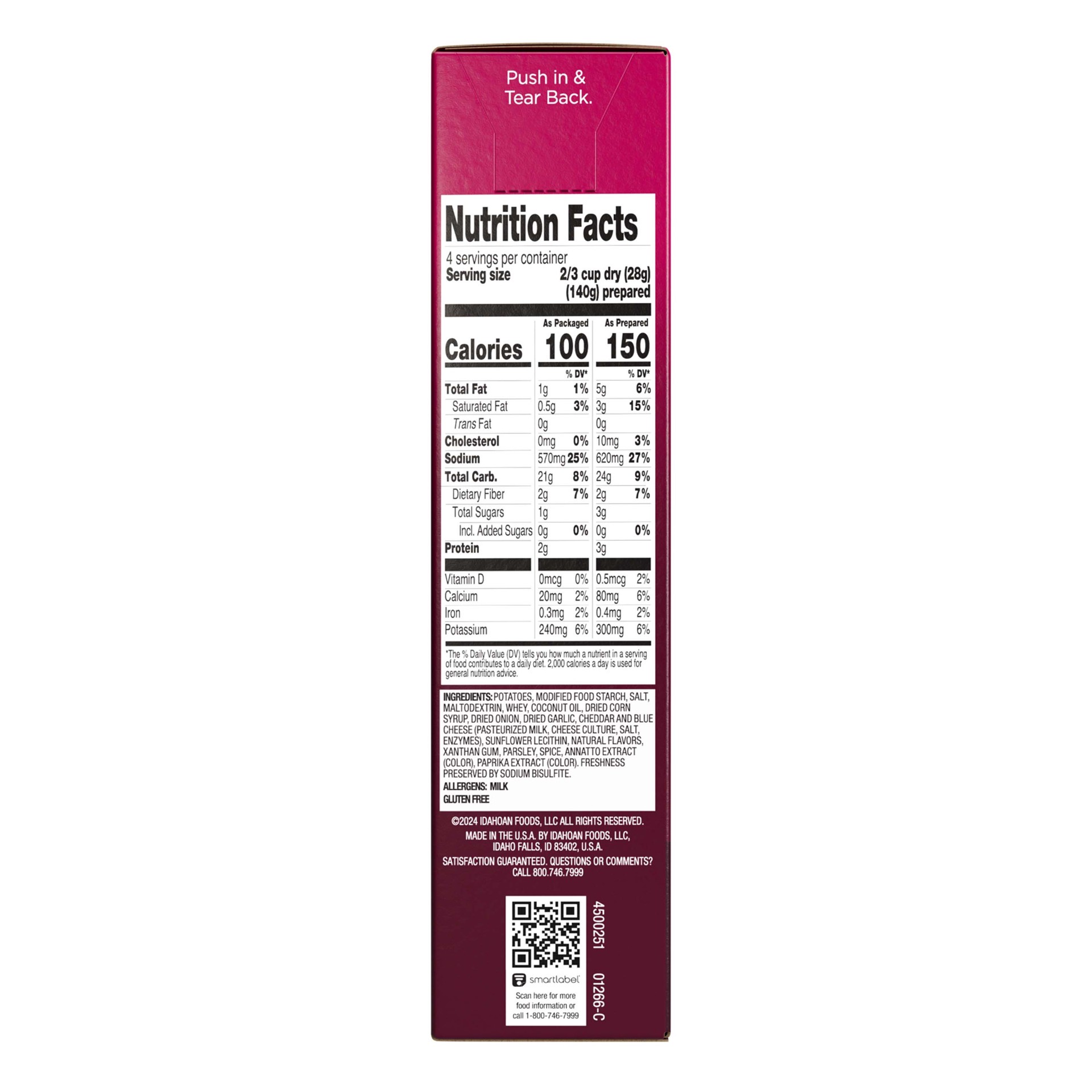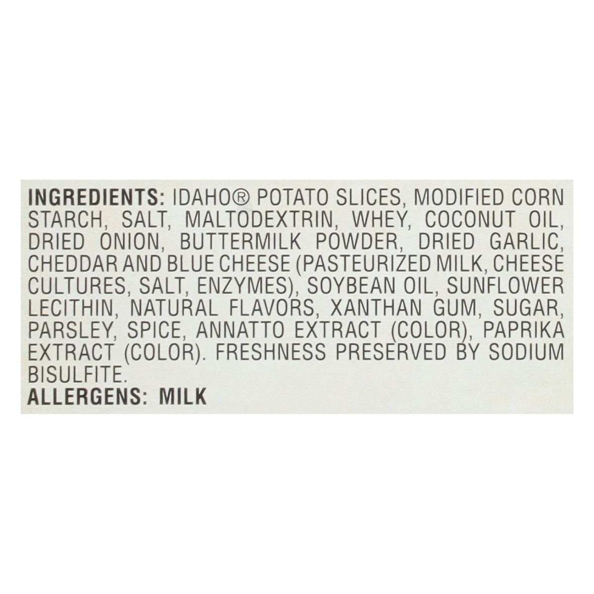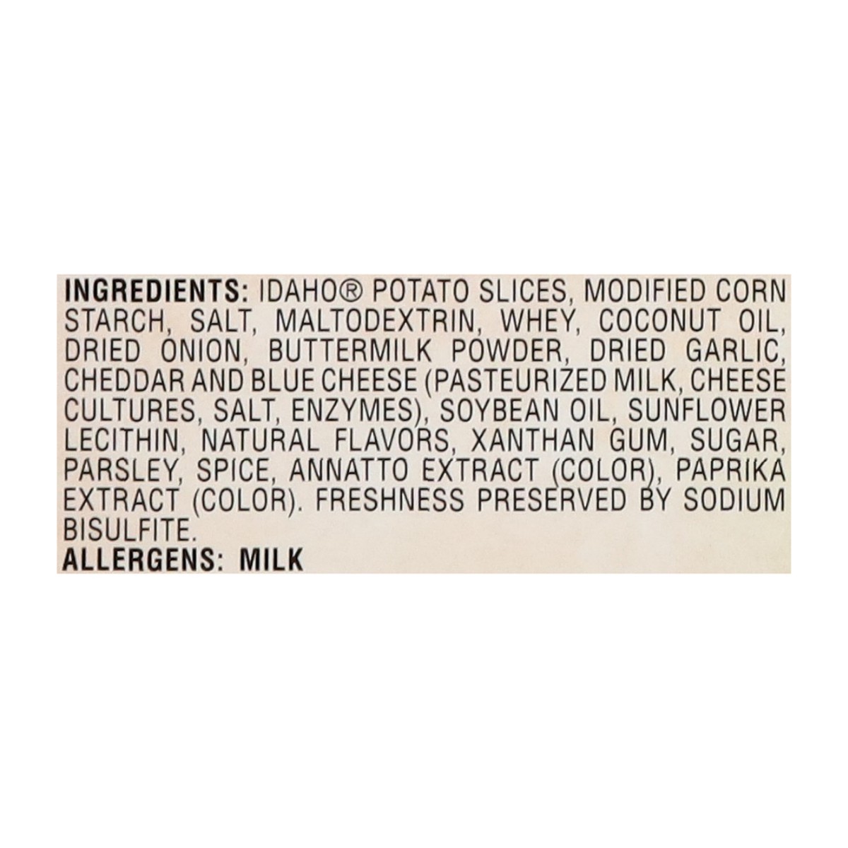 IDAHO POTATO SLICES, MODIFIED CORN STARCH, SALT, MALTODEXTRIN, WHEY, COCONUT OIL, DRIED ONION, BUTTERMILK POWDER, DRIED GARLIC, CHEDDAR AND BLUE CHEESE (PASTEURIZED MILK, CHEESE CULTURES, SALT, ENZYME…