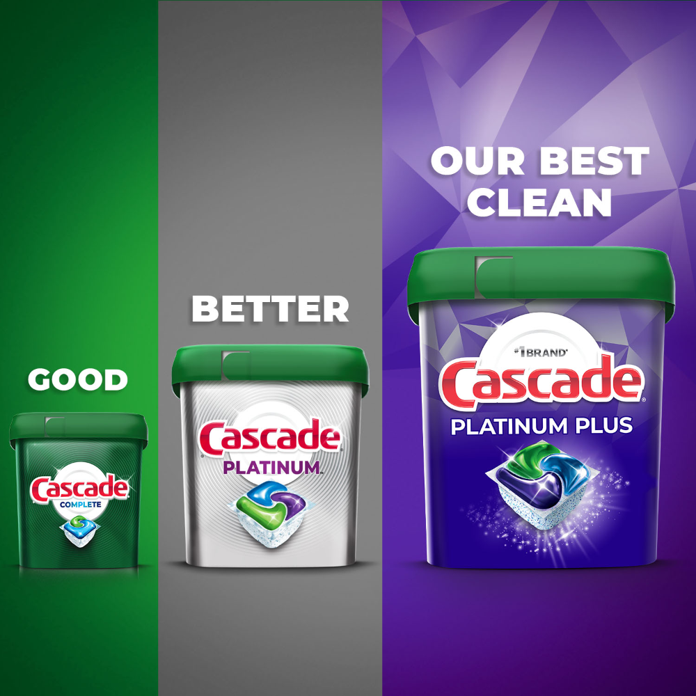 - Cascade Platinum Plus contains 2X* the Dawn grease fighting power and 2X* the scrubbing power to power through dried on food *Cleaning ingredients vs Cascade Complete ActionPacs