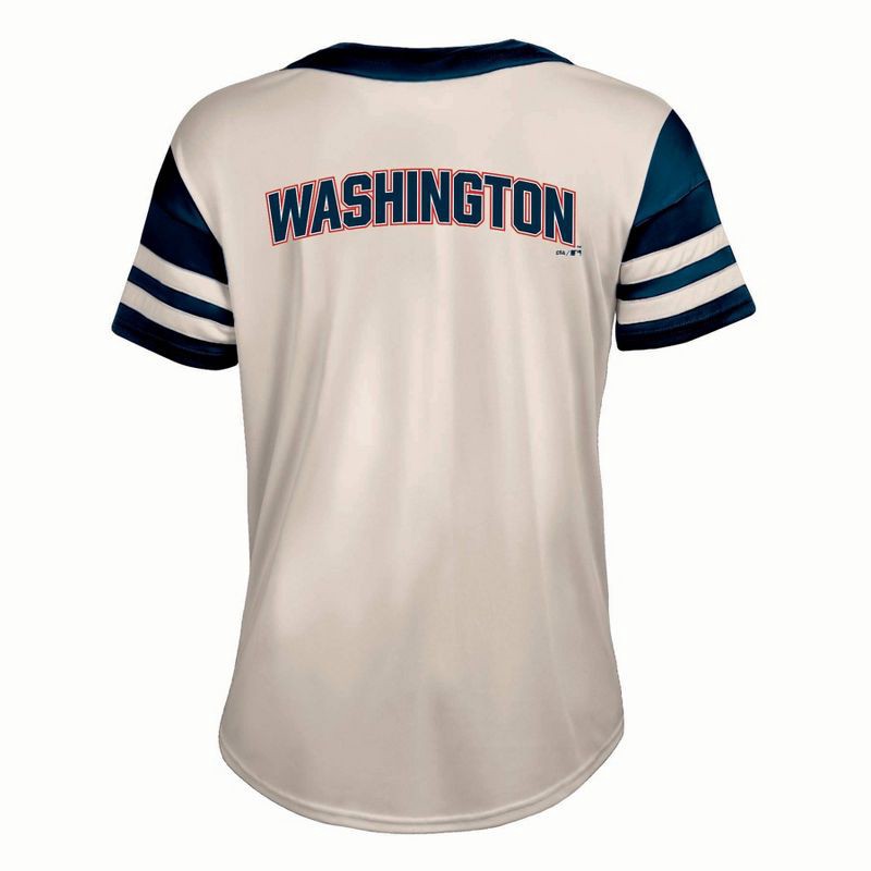 Game-day style just got a fun upgrade with this relaxed fit fashion short sleeve button-up tee. Jersey-inspired, the sleeve taping creates an athletic look, while the off-white ground and team color t…