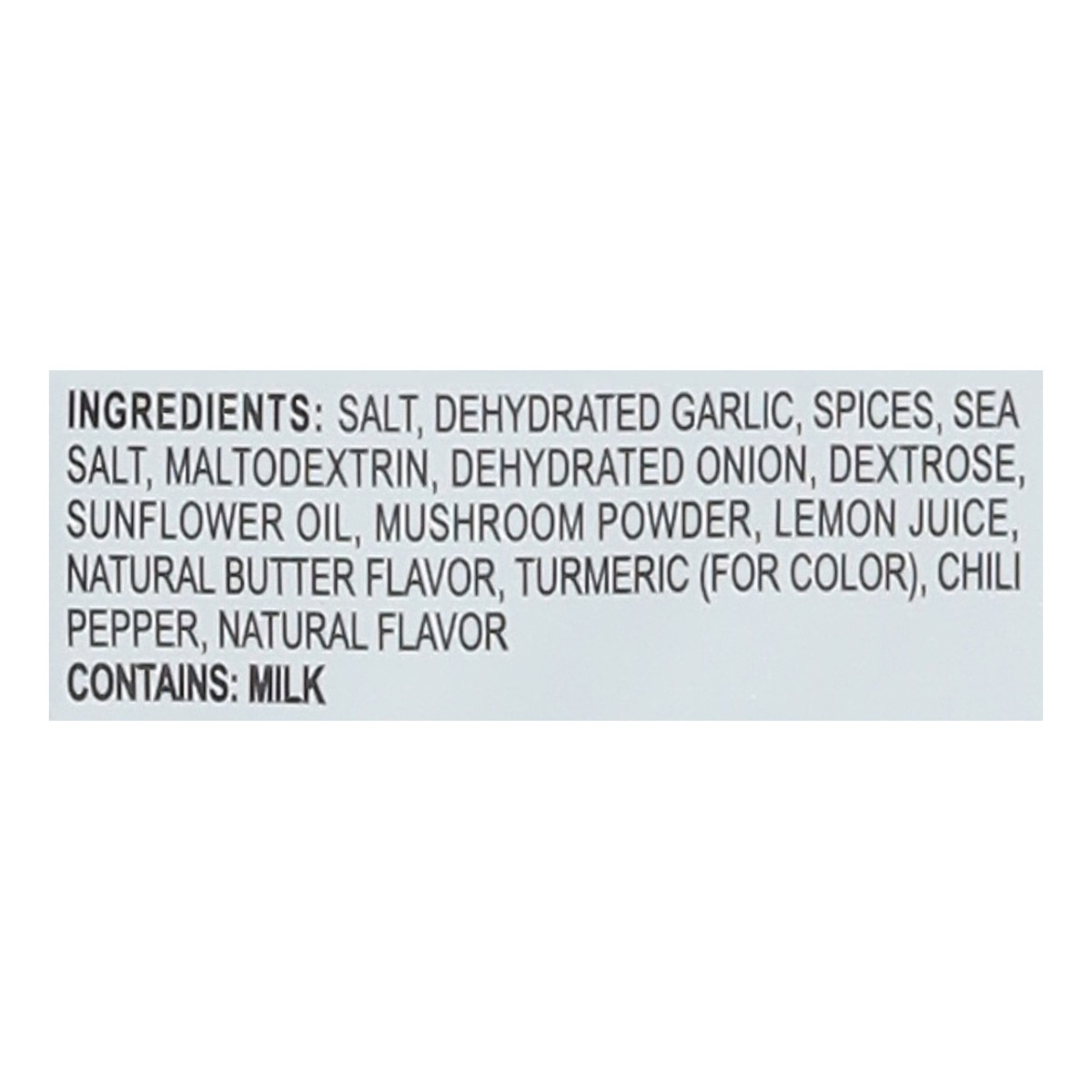 Salt, Dehydrated Garlic, Spices, Sea Salt, Maltodextrin, Dehydrated Onion, Dextrose, Sunflower Oil, Mushroom Powder, Lemon Juice, Natural Butter Flavor, Turmeric (for Color), Chili Pepper, Natural Fla…