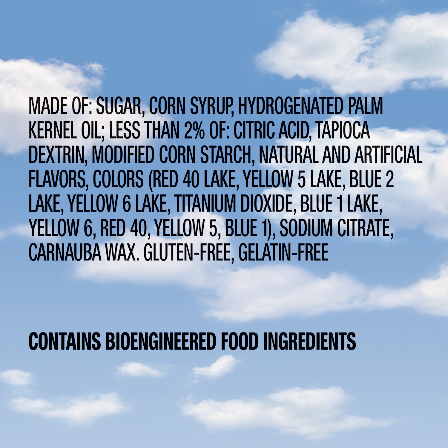 SUGAR, CORN SYRUP, HYDROGENATED PALM KERNEL OIL; LESS THAN 2% OF: CITRIC ACID, TAPIOCA DEXTRIN, MODIFIED CORN STARCH, NATURAL AND ARTIFICIAL FLAVORS, COLORS (INCLUDES RED 40 LAKE, YELLOW 5 LAKE, BLUE …