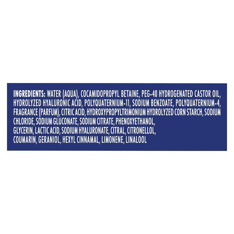 Water, Cocamidopropyl Betaine, Hydrolyzed Hyaluronic Acid, Hydrolyzed Elastin, Collagen Amino Acids, Hydrolyzed Keratin, PEG-40 Hydrogenated, Castor Oil, Polyquaternium-11, Sodium Benzoate, Polyquater…