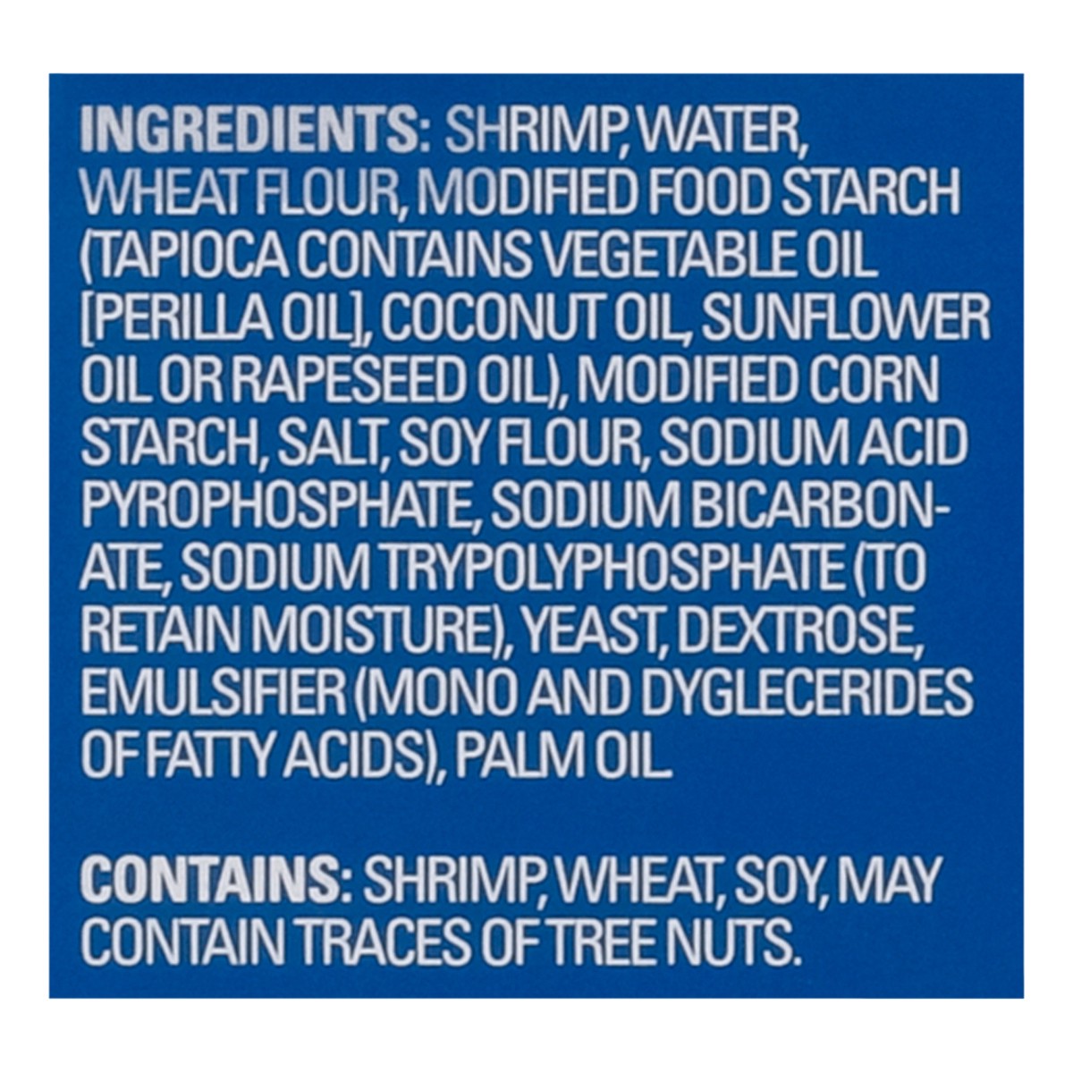 Shrimp, Water, Wheat Flour, Modified Food Starch (Tapioca Contains Vegetable Oil [Perilla Oil], Coconut Oil Sunflower Oil or Rapeseed Oil) Modified Corn Starch, Salt, Soy Flour, Sodium Acid Pyrophosph…