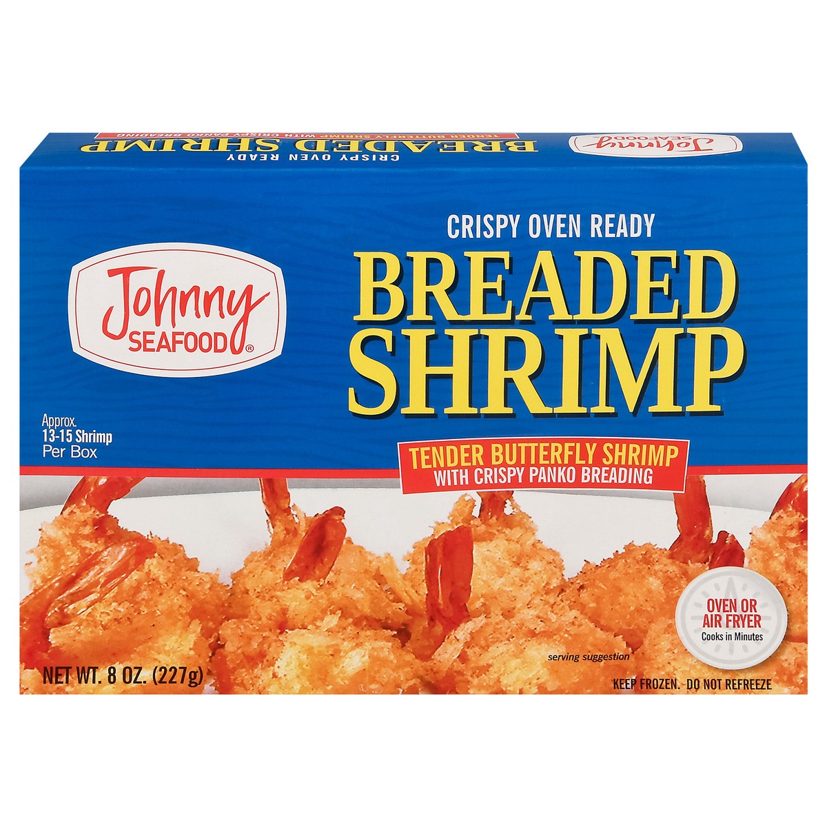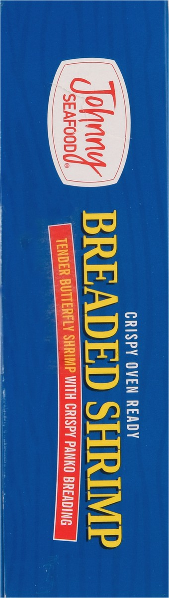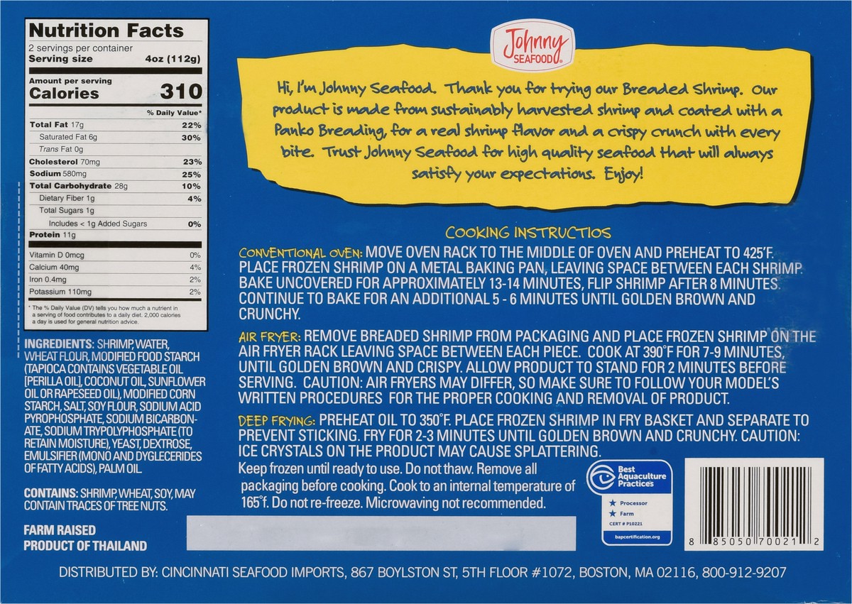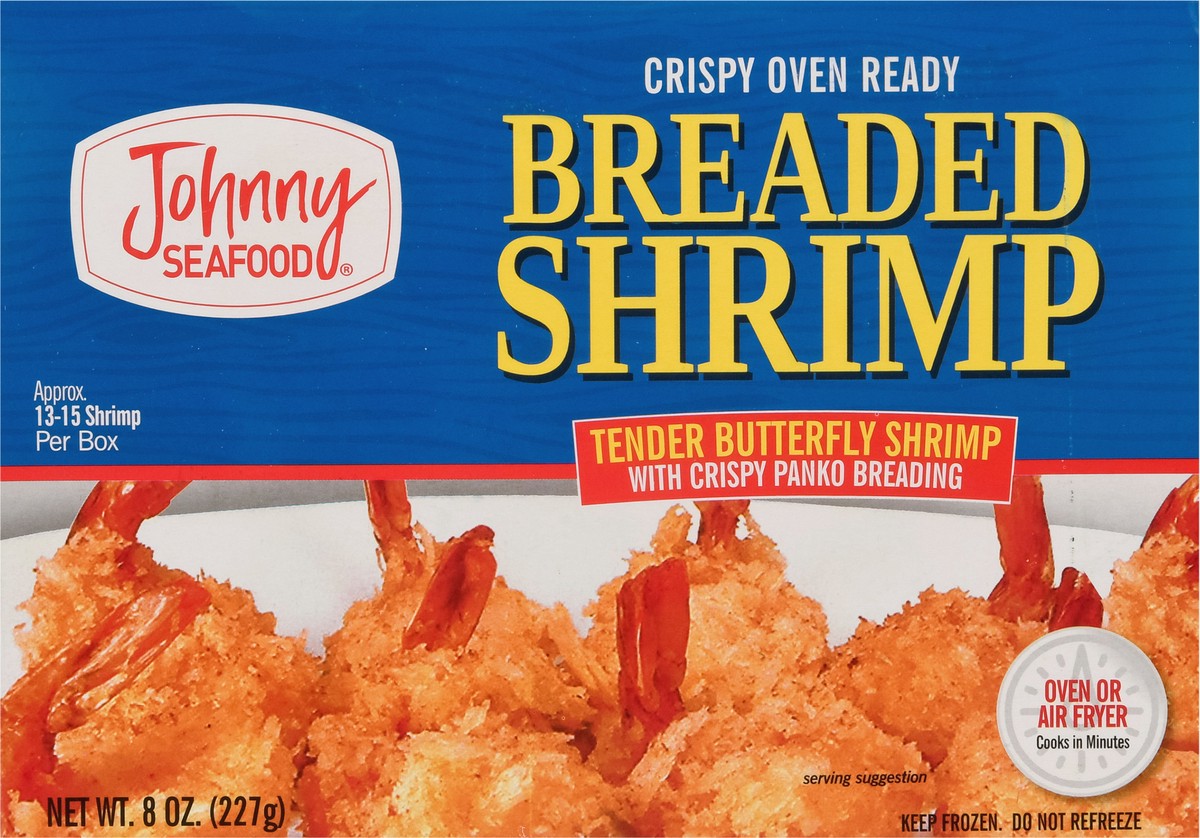 Crispy oven ready. Approx 13-15 shrimp per box. Oven or air fryer. Cooks in minutes. Farm raised. Hi, I'm Johnny Seafood. Thank you for trying our Breaded Shrimp. Our product is made from sustainably …