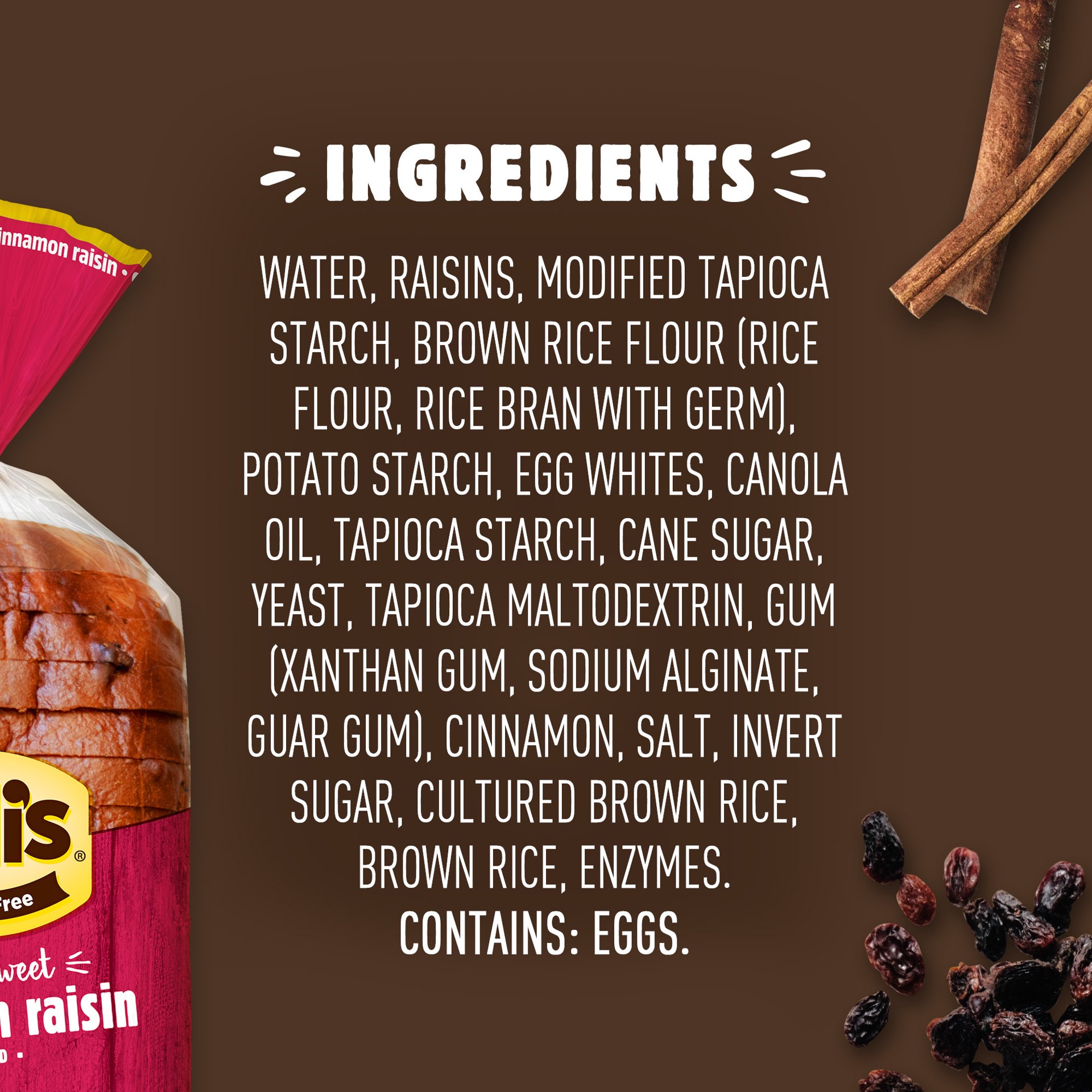 Water, Raisins, Modified Tapioca Starch, Brown Rice Flour, Potato Starch, Dried Cane Syrup, Egg Whites, Tapioca Starch, Tapioca Maltodextrin, Yeast, Cinnamon, Salt, Gum (Xanthan Gum, Sodium Alginate, …