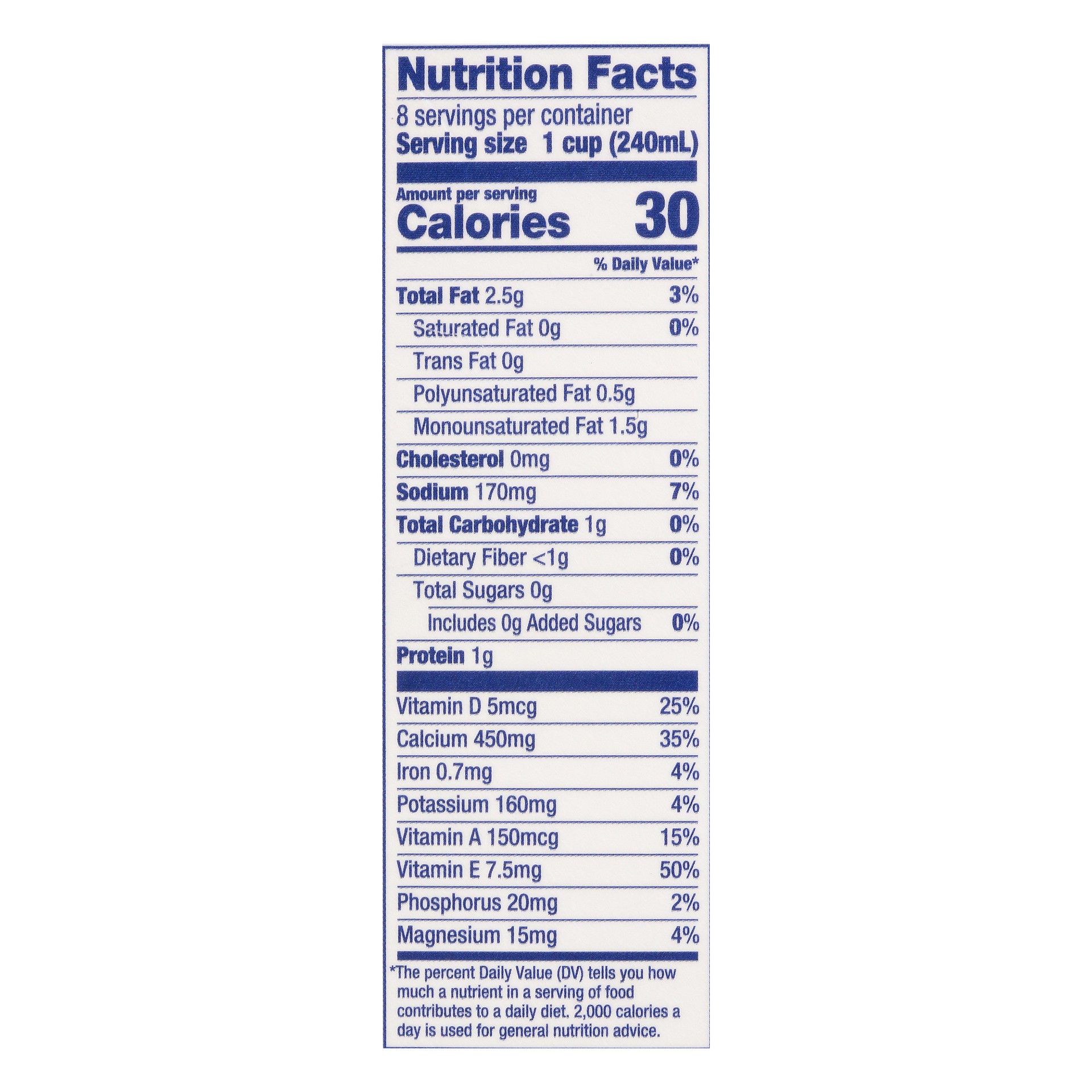 Almondmilk (Filtered Water, Almond), Calcium Carbonate, Natural Flavors, Sea Salt, Potassium Citrate, Sunflower Lecithin, Gellan Gum, Vitamin A Palmitate, Vitamin D2, D-Alpha-Tocopherol (Natural Vitam…