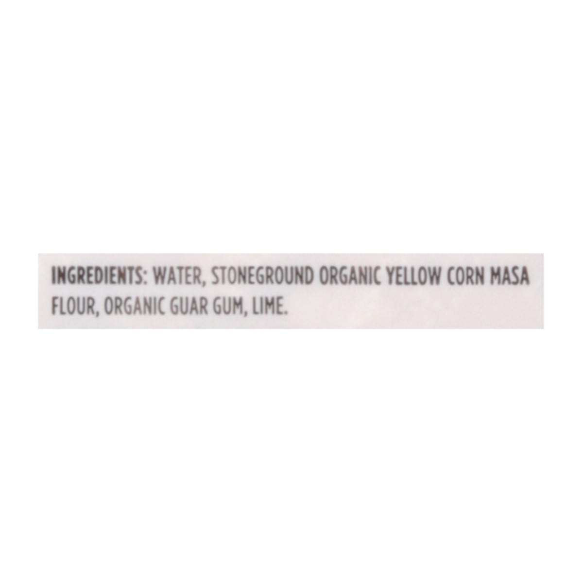 Water, Stoneground Organic Yellow Corn Masa Flour, Organic Guar Gum, Lime.