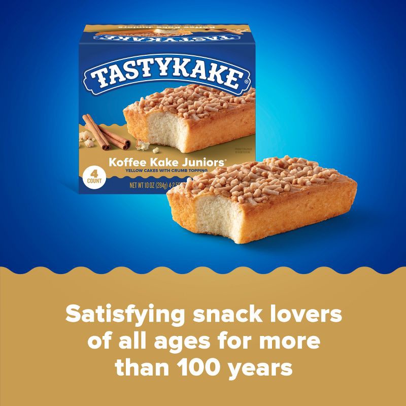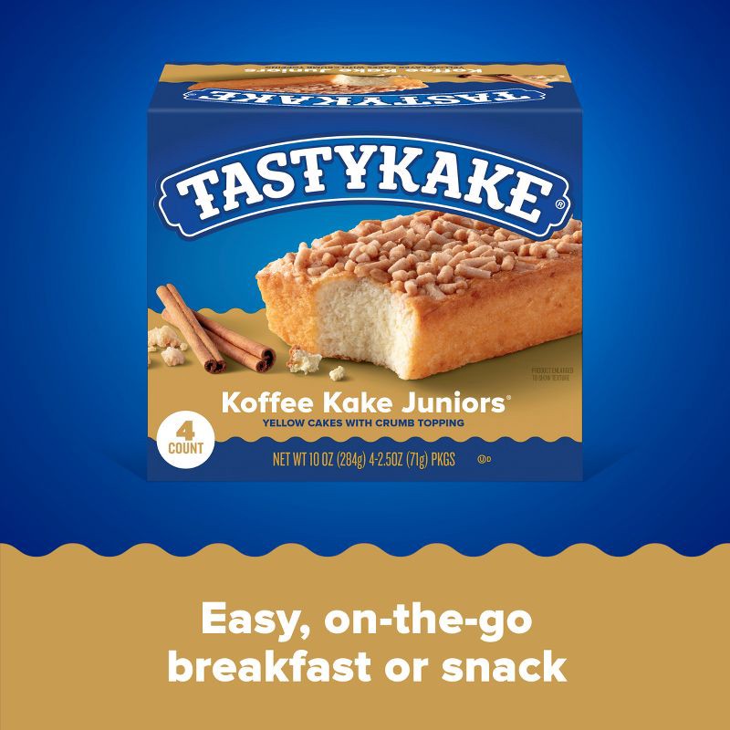 With moist yellow cake and a cinnamon crumble topping, Tastykake® Koffee Kake Juniors® are bound to satisfy any sweet tooth. These snack cakes are made to be enjoyed morning, noon and night. Pair Tast…