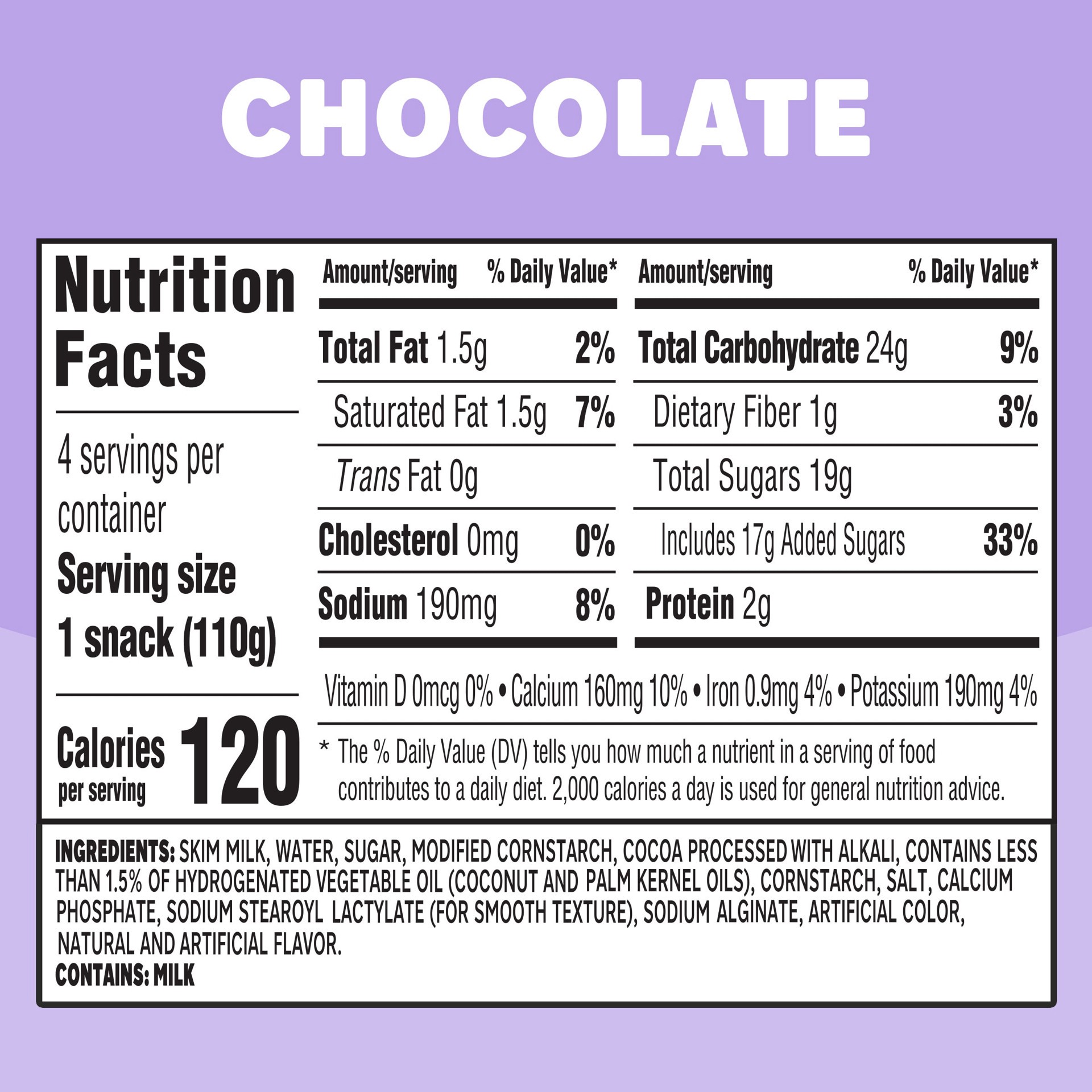 SKIM MILK, WATER, SUGAR, MODIFIED CORNSTARCH, COCOA PROCESSED WITH ALKALI, CONTAINS LESS THAN 1.5% OF HYDROGENATED VEGETABLE OIL (COCONUT AND PALM KERNEL OILS), CORNSTARCH, SALT, CALCIUM PHOSPHATE, SO…