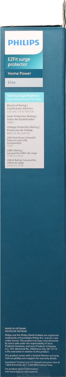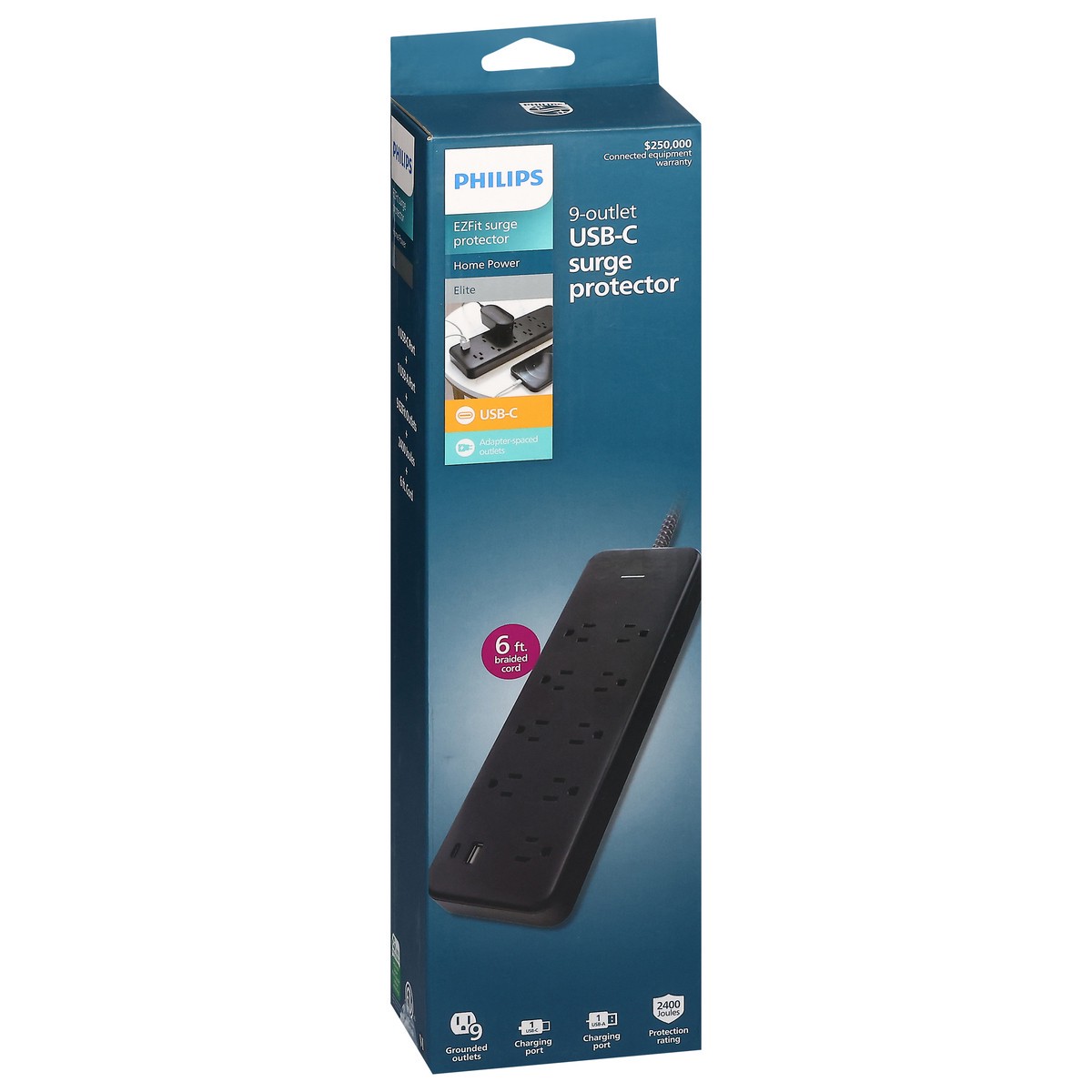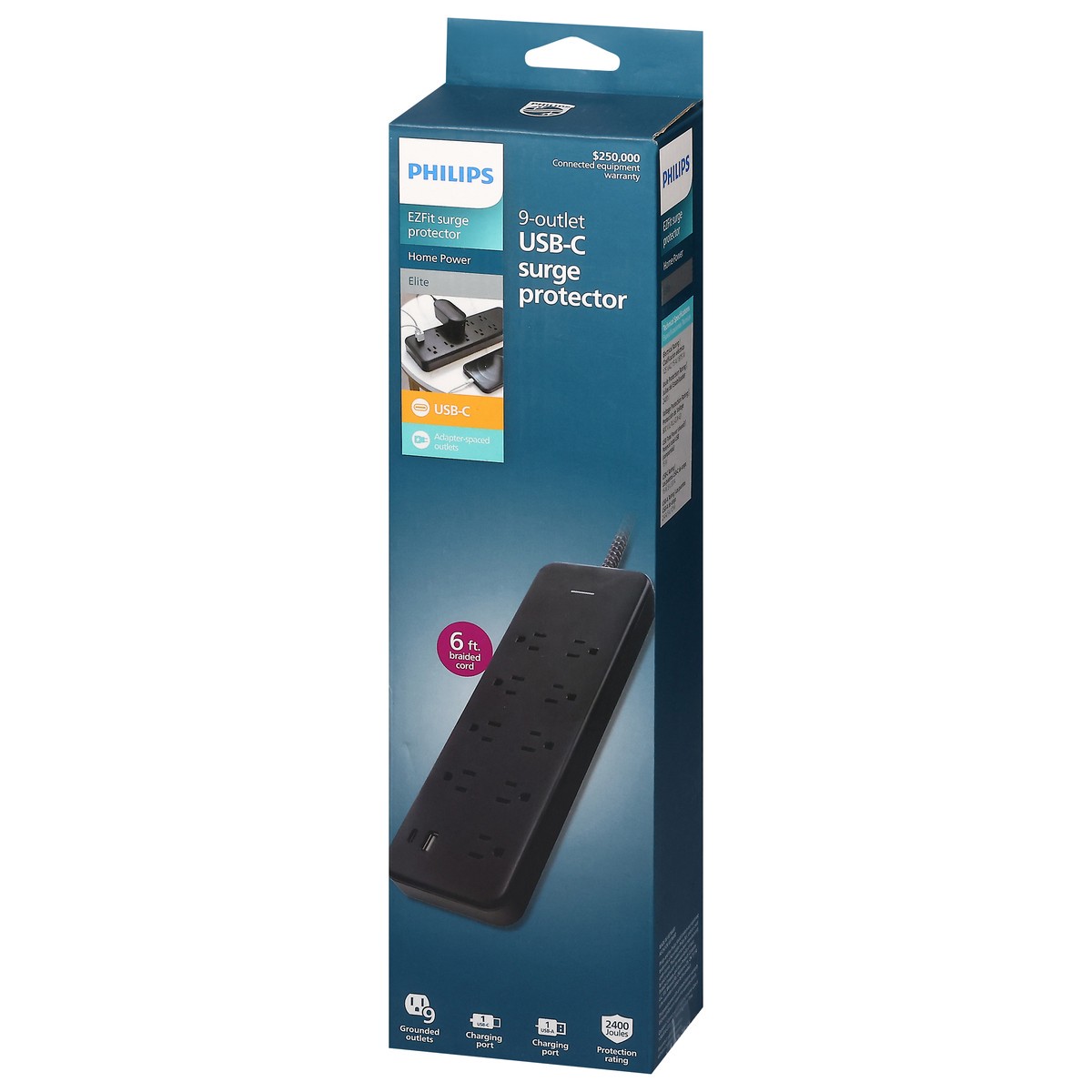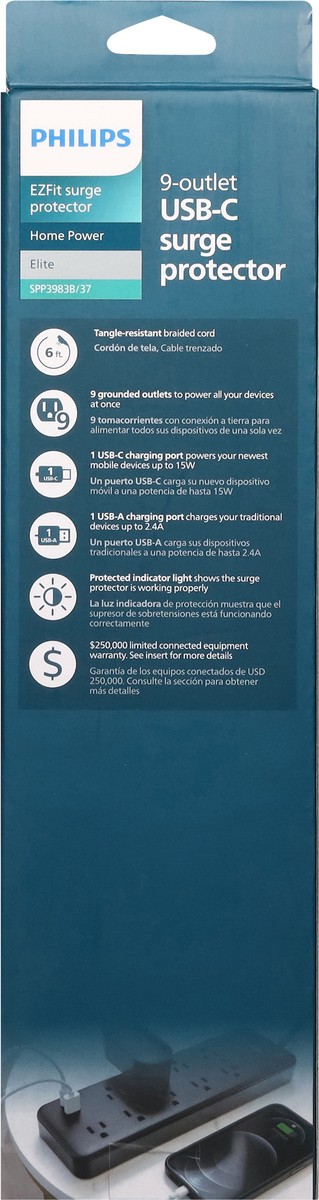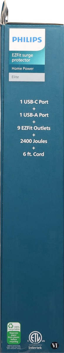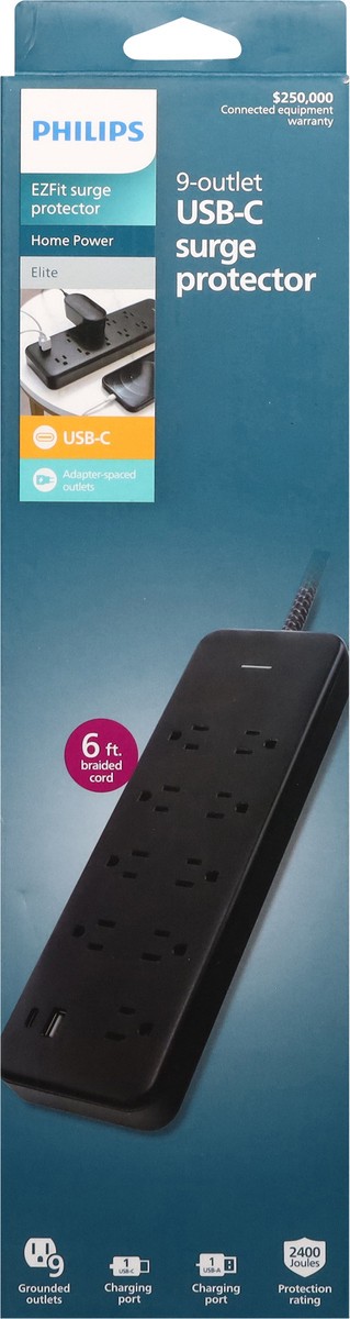 Philips EZFit Elite 9-Outlet USB-C Surge Protector - 6 ft