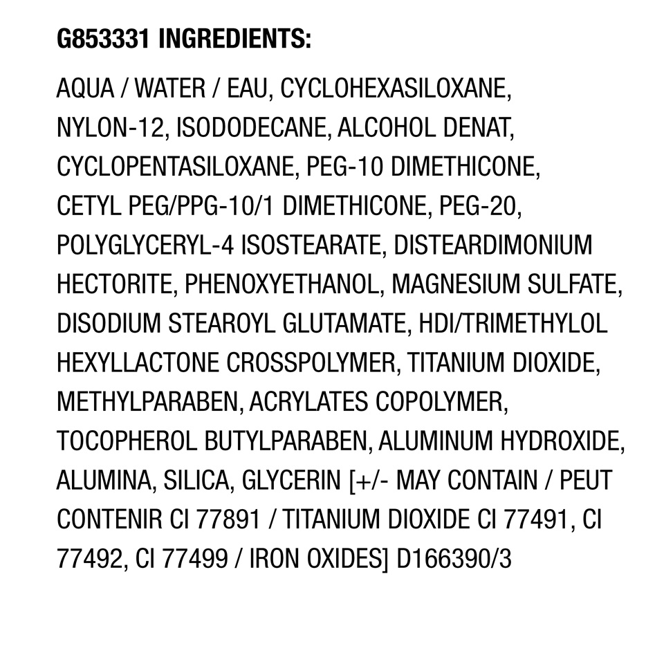 Aqua / Water, Cyclohexasiloxane, Nylon-12, Isododecane, Alcohol Denat, Cyclopentasiloxane, PEG-10 Dimethicone, Cetyl PEG/PPG-10/1 Dimethicone, PEG-20, Polyglyceryl-4 Isostearate, Disteardimonium Hecto…