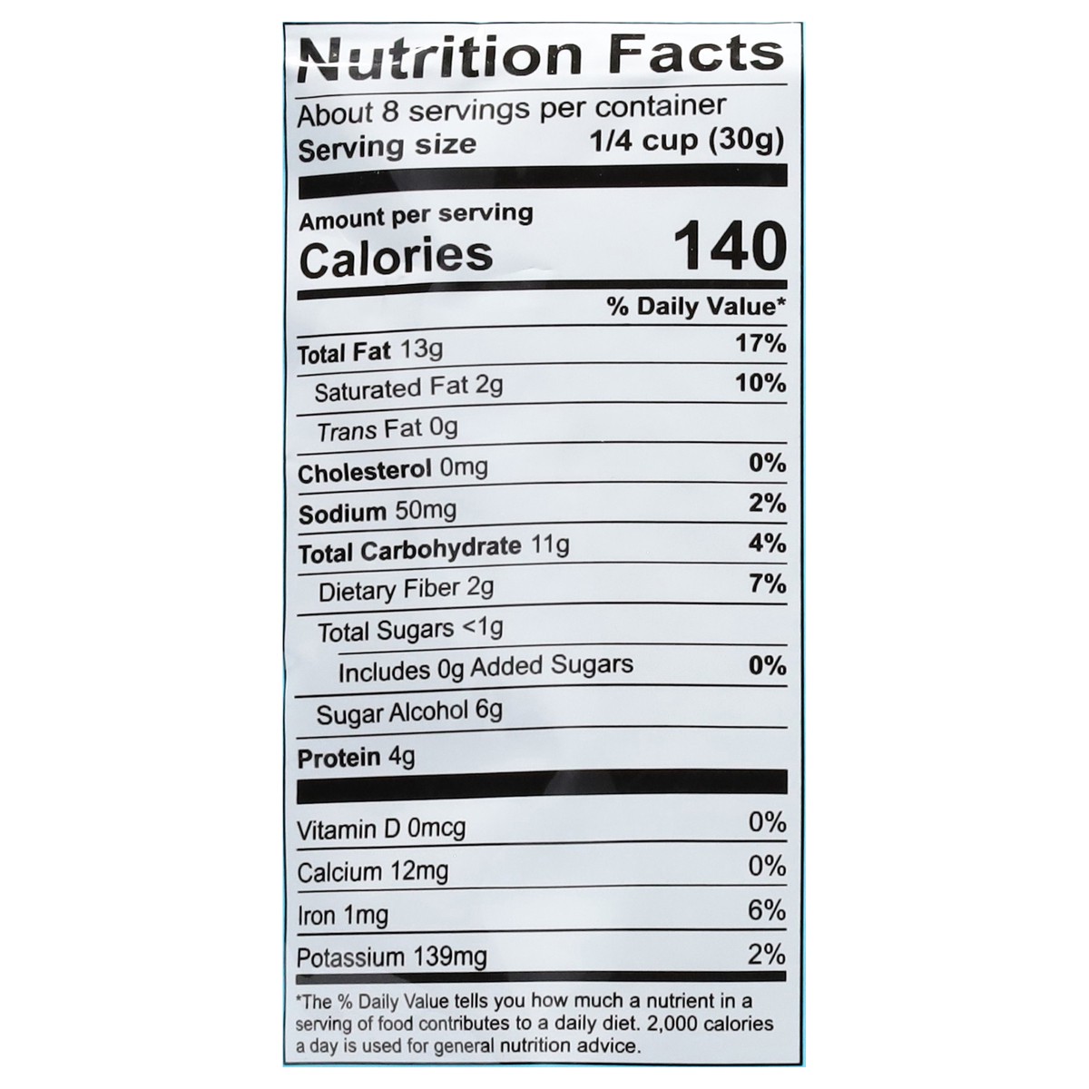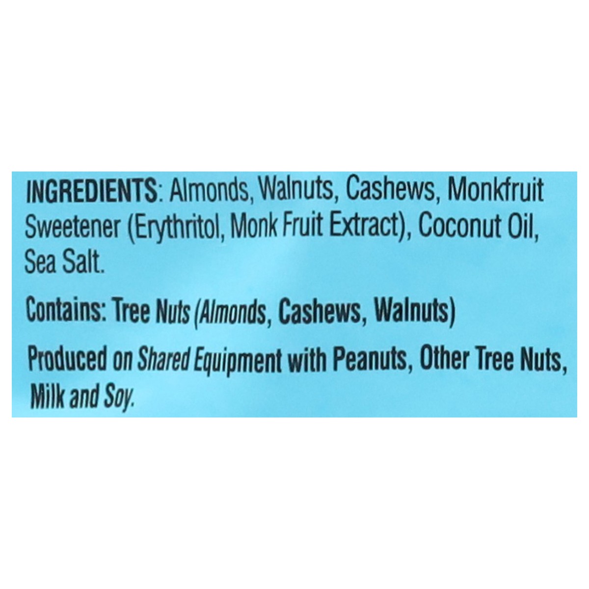 Almonds, Walnuts, Cashews, Monkfruit Sweetener (Erythritol, Monk Fruit Extract), Coconut Oil, Sea Salt.