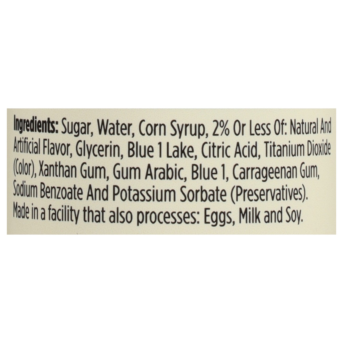 Sugar, Water, Corn Syrup, 2% or Less of: Natural and Artificial Flavor, Glycerin, Blue 1 Lake, Citric Acid, Titanium Dioxide (Color), Xanthan Gum, Gum Arabic, Blue 1, Carrageenan Gum, Sodium Benzoate …