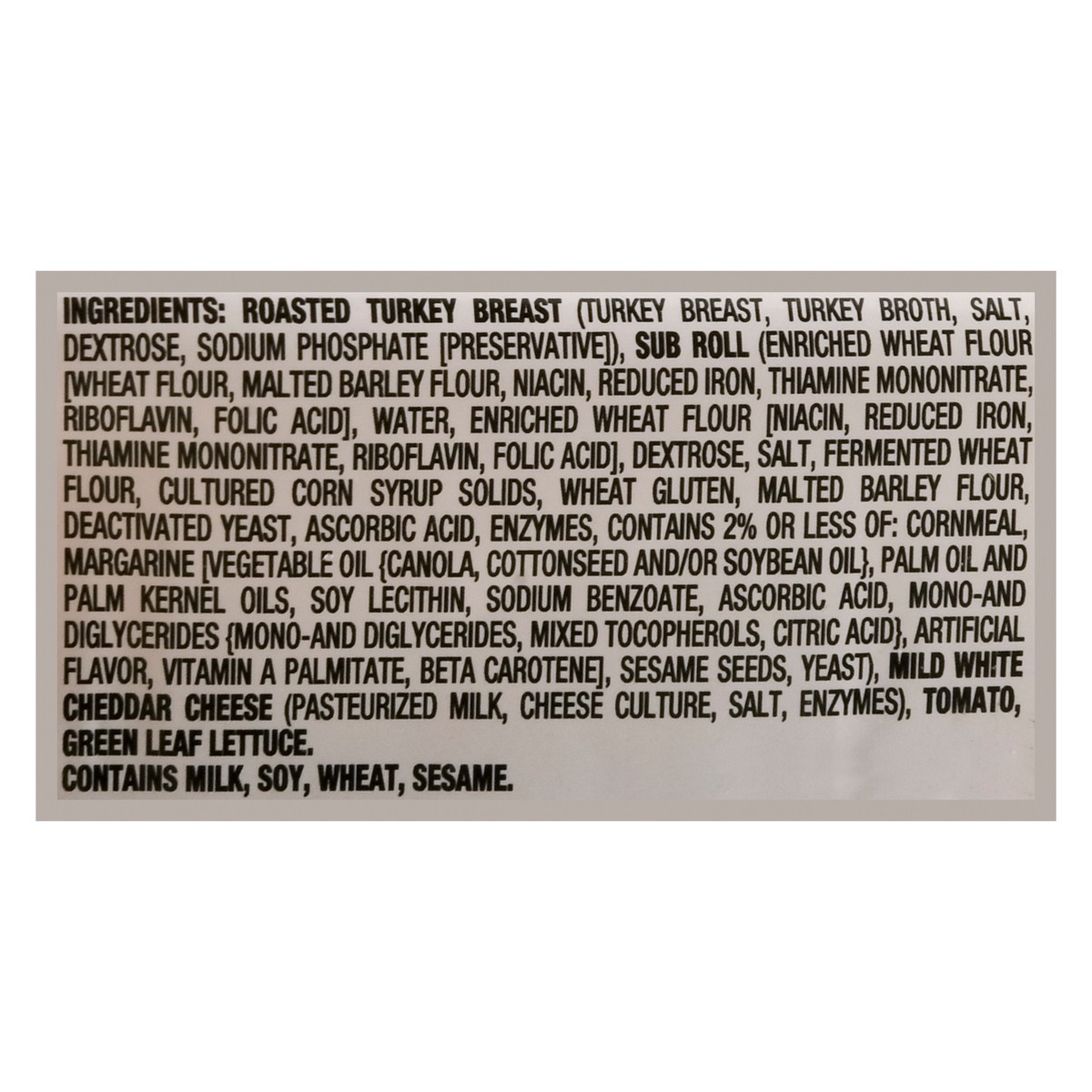 Roasted Turkey Breast (Turkey Breast, Turkey Broth, Salt, Dextrose, Sodium Phosphate [Preservative]), Sub Roll (Enriched Wheat Flour [Wheat Flour, Malted Barley Flour, Niacin, Reduced Iron, Thiamine M…