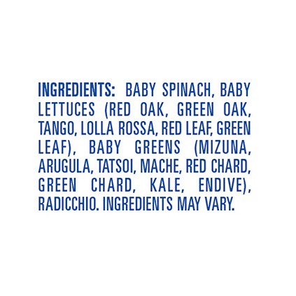 Baby Spinach, Baby Lettuces (Red Oak, Green Oak, Tango, Lolla Rossa, Red Leaf, Green Leaf), Baby Greens (Mizuna, Arugula, Tatsoi, Mache, Red Chard, Green Chard, Kale, Endive), Radicchio.