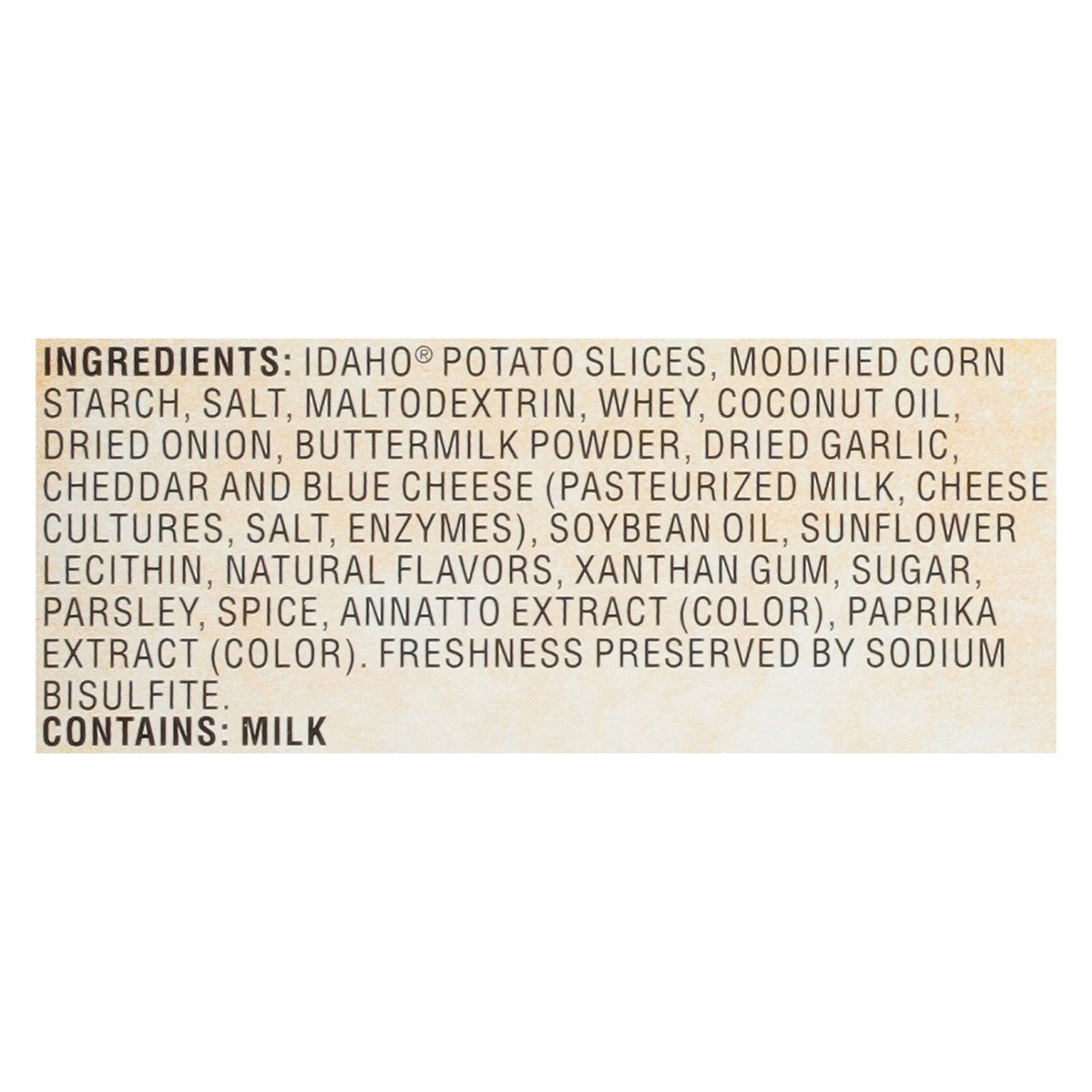 IDAHO POTATO SLICES, MODIFIED CORN STARCH, SALT, MALTODEXTRIN, WHEY, COCONUT OIL, DRIED ONION, BUTTERMILK POWDER, DRIED GARLIC, CHEDDAR AND BLUE CHEESE (PASTEURIZED MILK, CHEESE CULTURES, SALT, ENZYME…