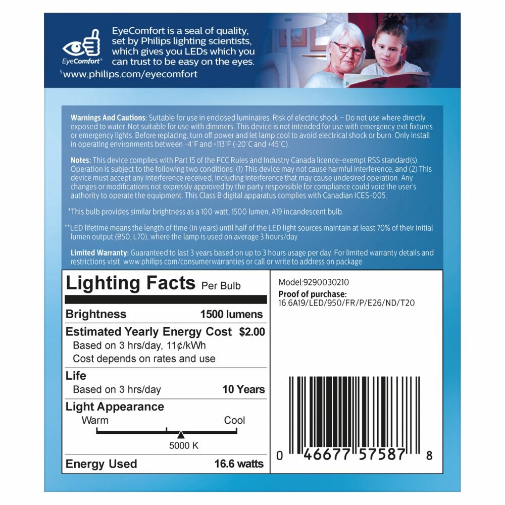 Philips EyeComfort LED bulbs are designed to be comfortable on your eyes, with no visible flicker or glare Enjoy long-lasting, beautiful light for up to 11,000 hours, or up to 10 years with average us…